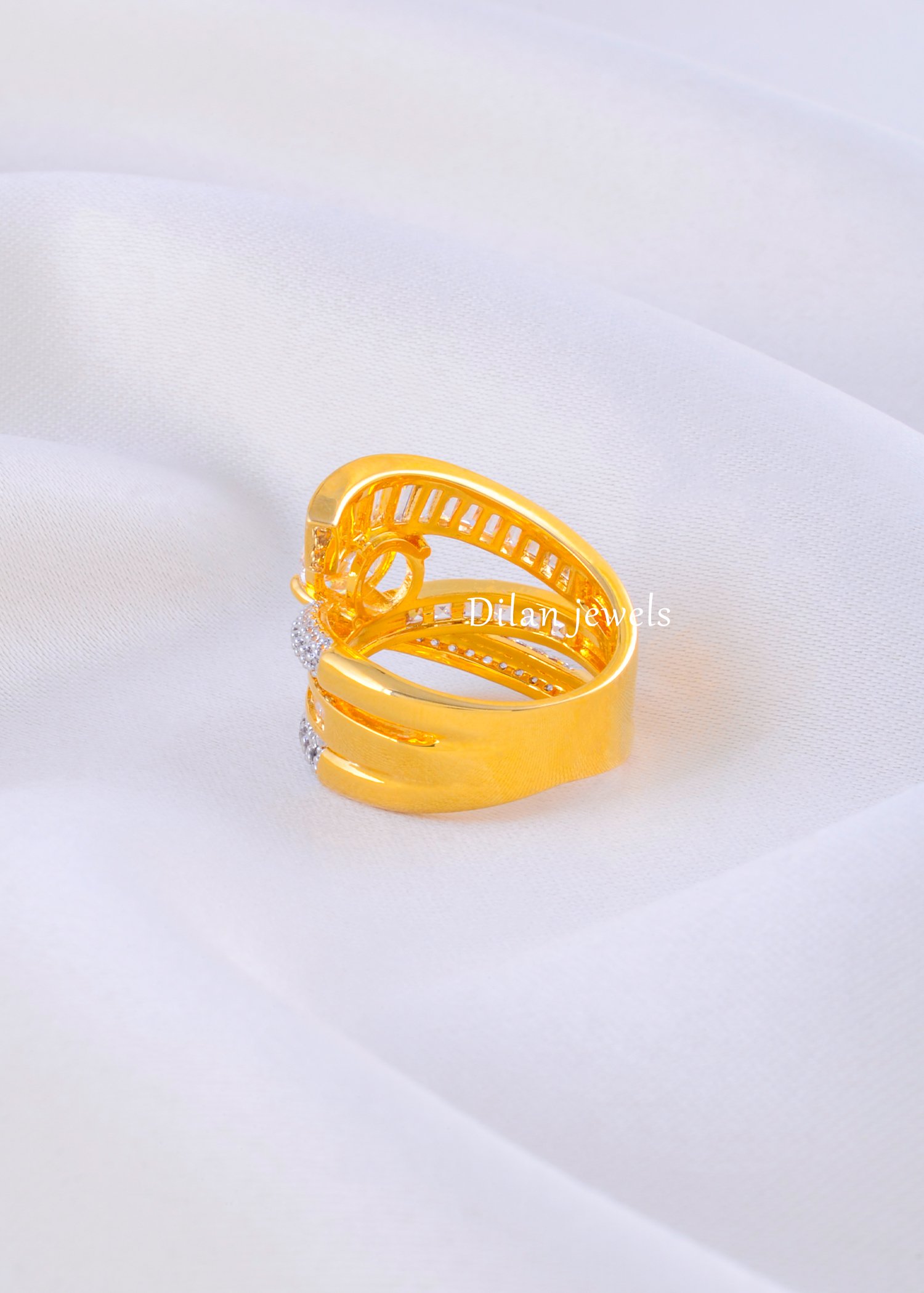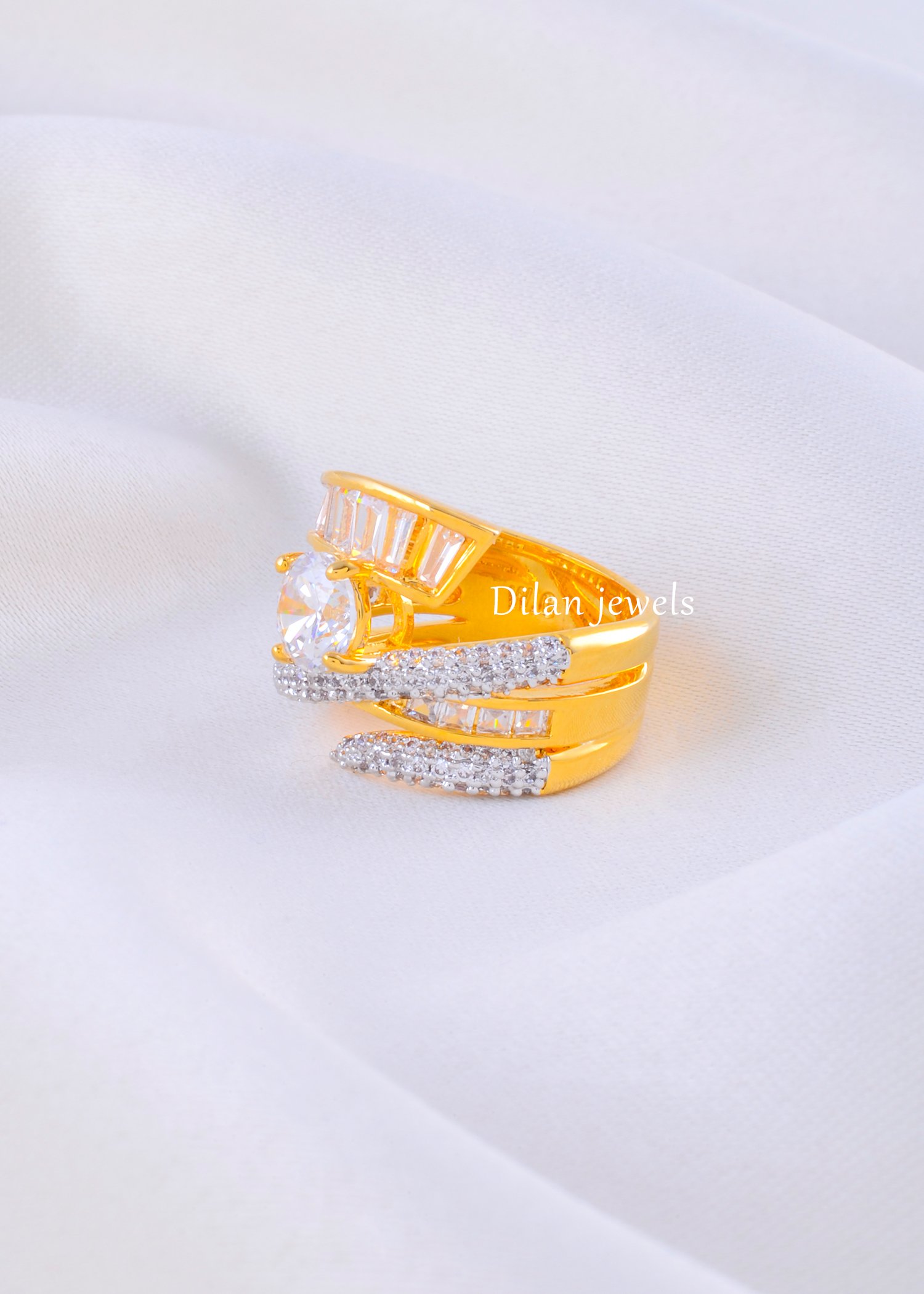 Embrace luxury with this stunning gold-plated German Silver ring, expertly crafted to combine traditional charm with contemporary elegance. The ring features a dazzling round solitaire AAA-quality American Diamond as the focal point, held securely in a classic prong setting. The wide, multi-layered band is intricately adorned with rows of shimmering baguette and round-cut diamonds, creating a magnificent display of brilliance from every angle. The rich gold plating adds a touch of warmth and opulence, making this piece perfect for weddings, anniversaries, or special celebrations. Designed for comfort and durability, this statement ring offers the look of fine jewelry at an accessible price.