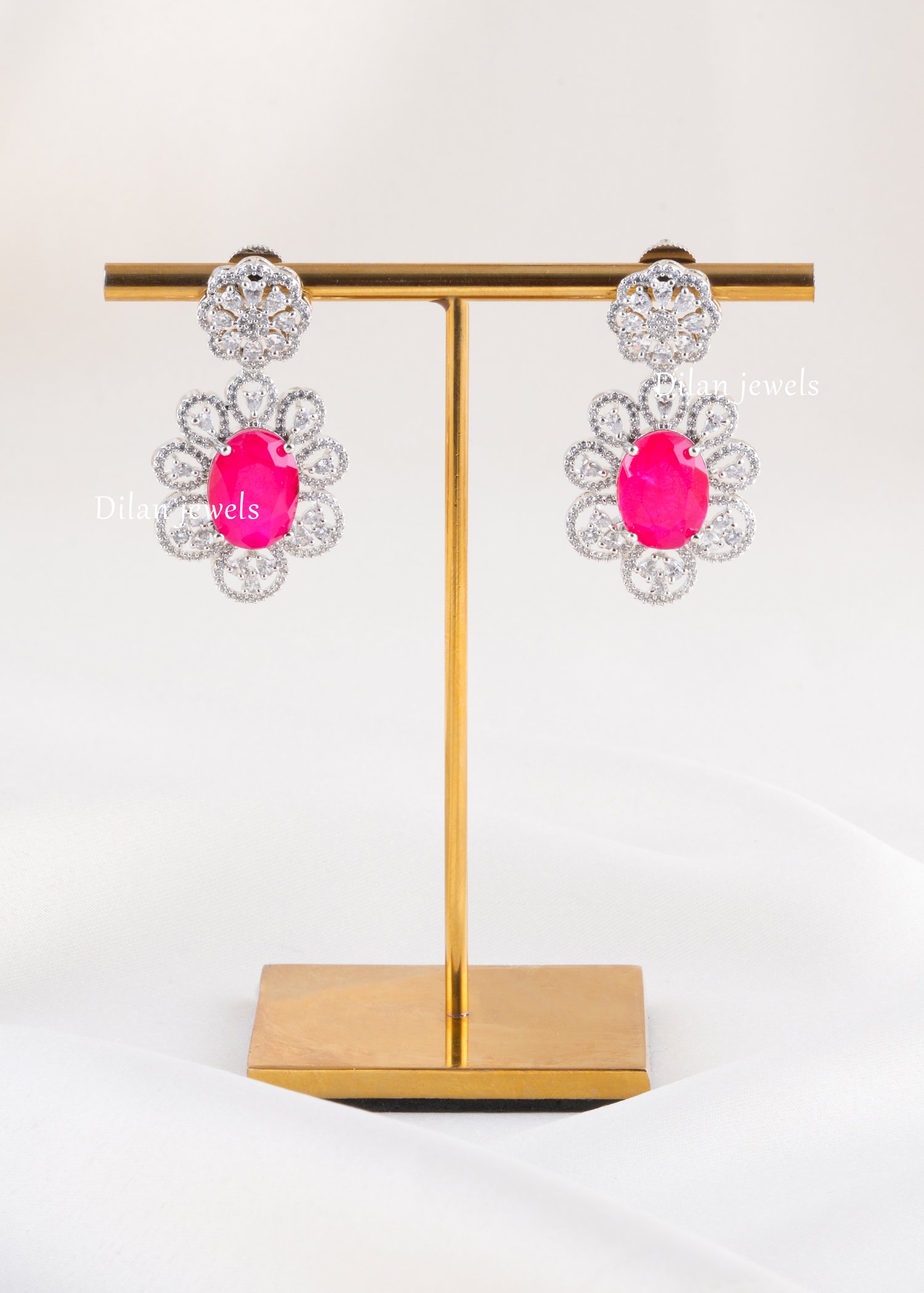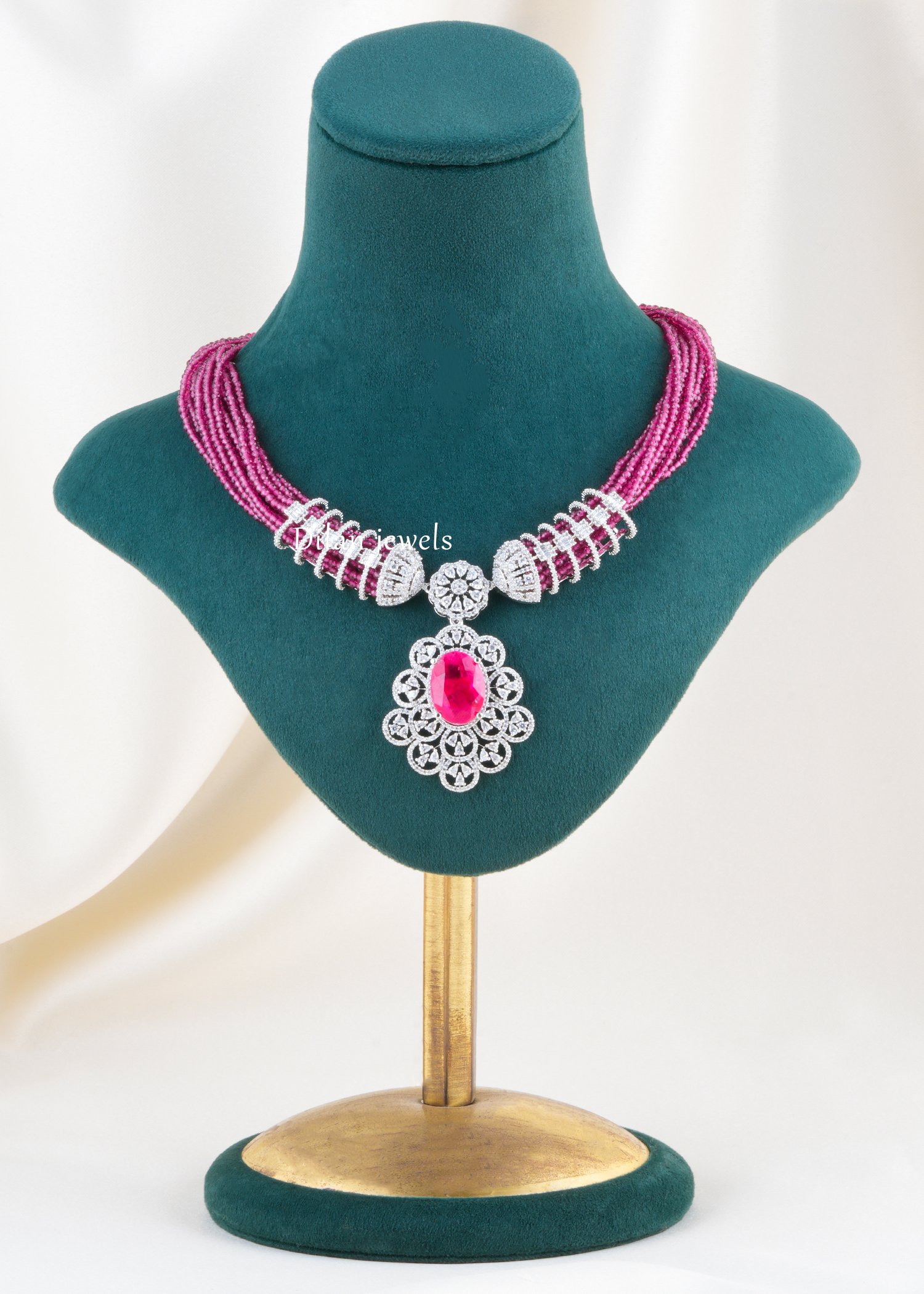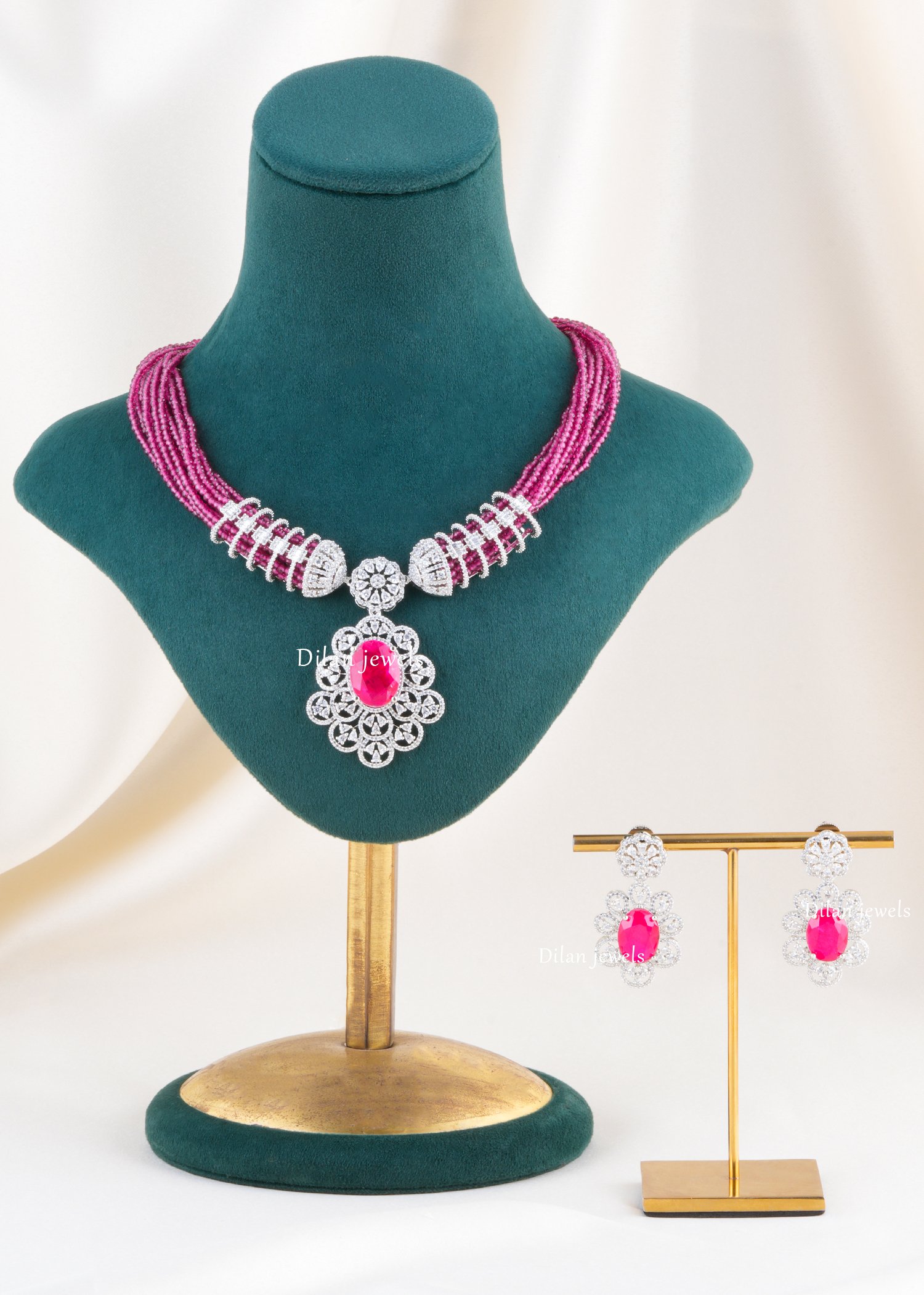 Elegant German silver necklace set embellished with AAA quality American diamonds and a striking fuchsia centre stone. Multiple strands of tiny pink beads wrap gracefully around the neck, meeting diamond-studded cylindrical connectors that frame an ornate pendant. The pendant showcases an oval fuchsia stone surrounded by intricate floral filigree and sparkling diamond halos for a luxurious, high‑shine look. Matching drop earrings mirror the same motif, completing this sophisticated ensemble. Perfect for weddings, receptions, cocktails, and festive events, this statement set adds bold colour and contemporary glamour to both traditional and Indo‑western outfits.