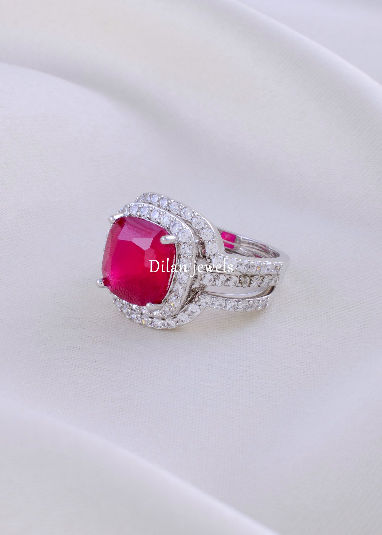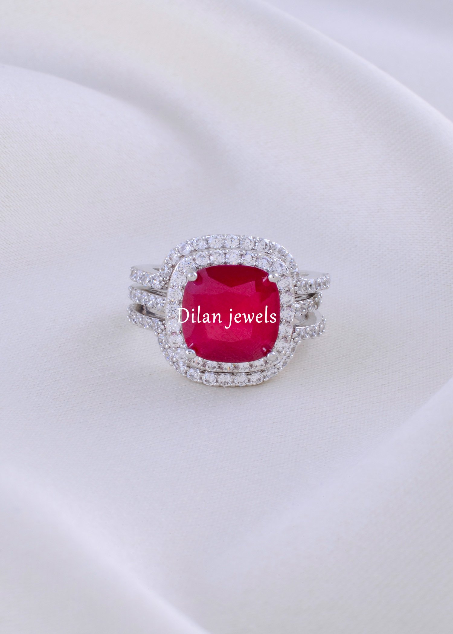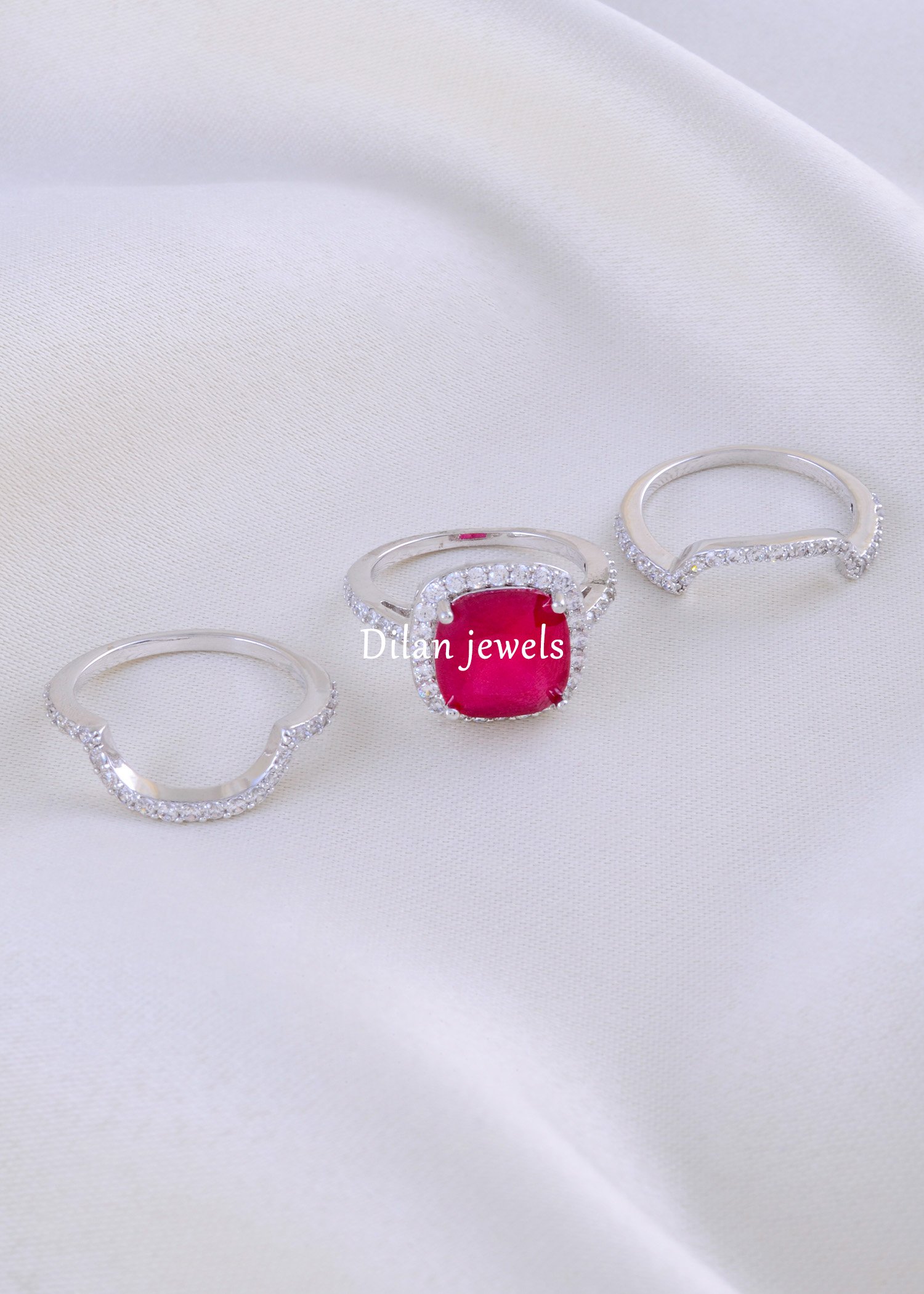 Ignite your style with this passionate 3-Piece Ruby Red Stackable Ring Set. At its heart lies a magnificent cushion-cut red gemstone, encircled by a halo of brilliant American Diamonds (CZ) that mimic the sparkle of real diamonds. The set features two matching curved eternity bands (ring jackets) that nestle perfectly above and below the centerpiece, creating a luxurious, triple-tiered look. Crafted in a gleaming silver finish, this versatile design offers endless styling possibilities—wear the solitaire alone for subtle elegance or stack all three for a dramatic, high-fashion statement perfect for cocktail parties.