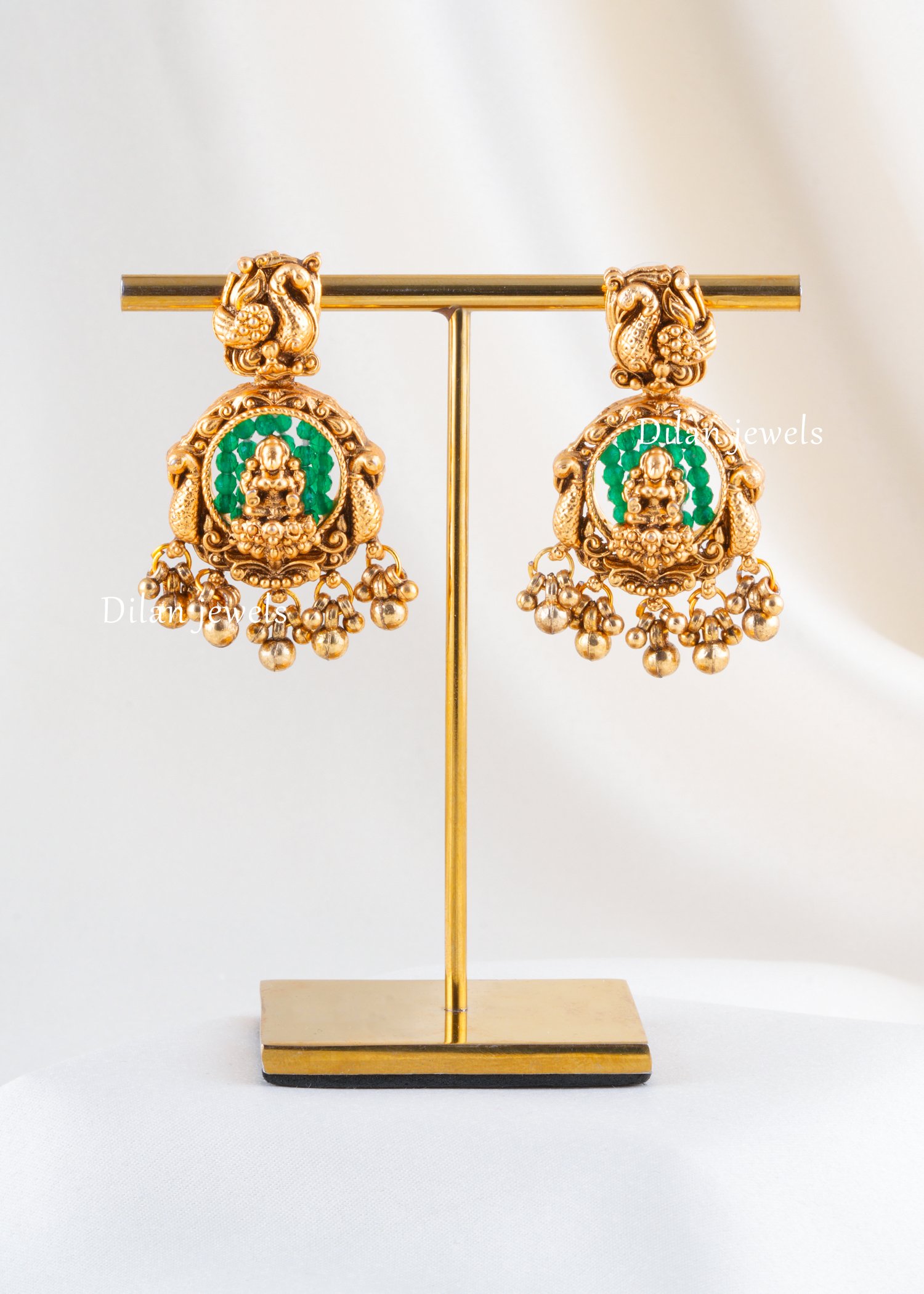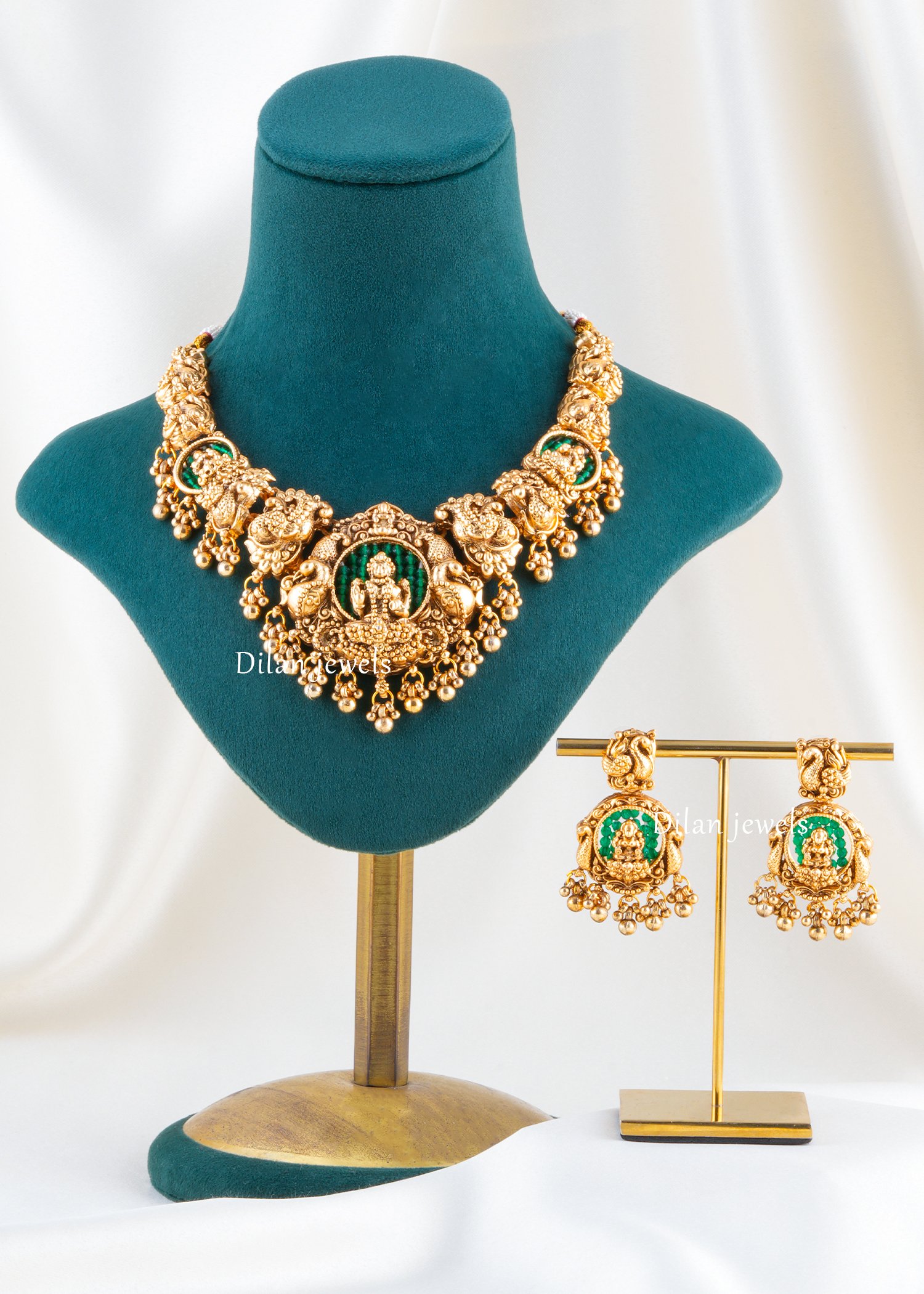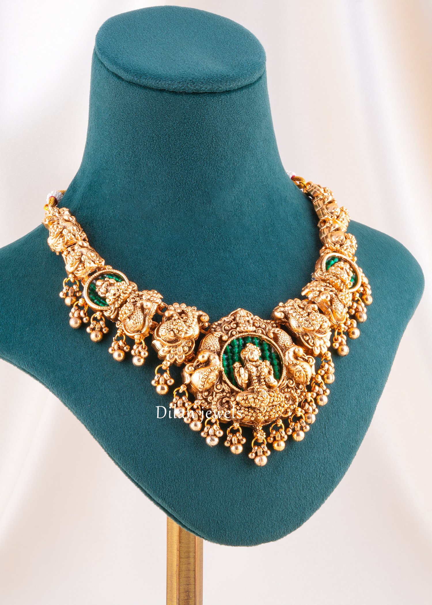 Embrace timeless tradition with this exquisite gold necklace set, designed to reflect regal heritage and intricate craftsmanship. Featuring detailed temple-inspired motifs with a striking central deity pendant, the set is beautifully enhanced with rich green accents and delicate dangling elements that add graceful movement. Paired with matching earrings, it creates a complete, statement-worthy look. With a necklace length of 14 cm, it sits elegantly on the neckline, making it perfect for weddings, festive occasions, and cultural celebrations. A true blend of classic artistry and luxurious appeal.