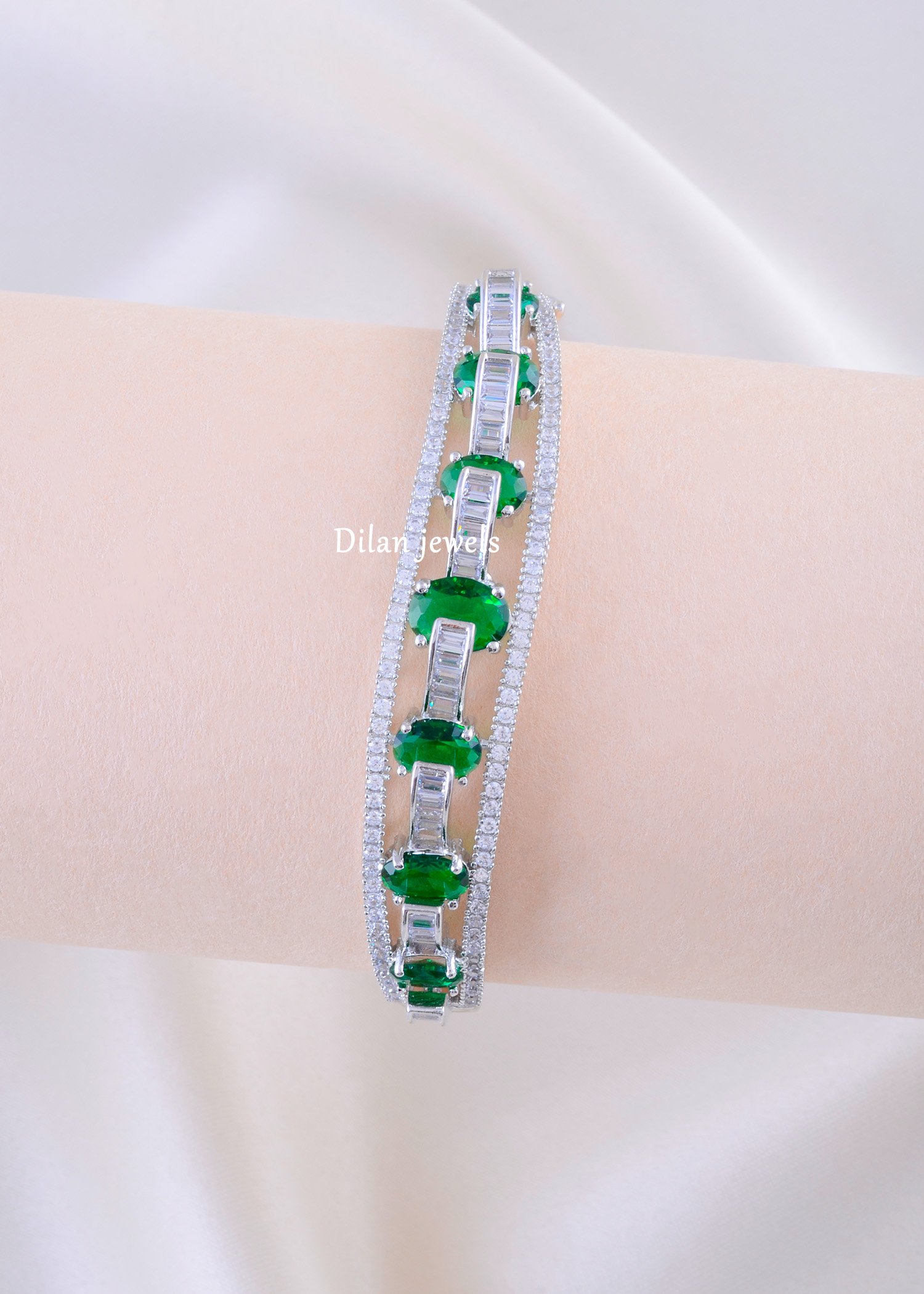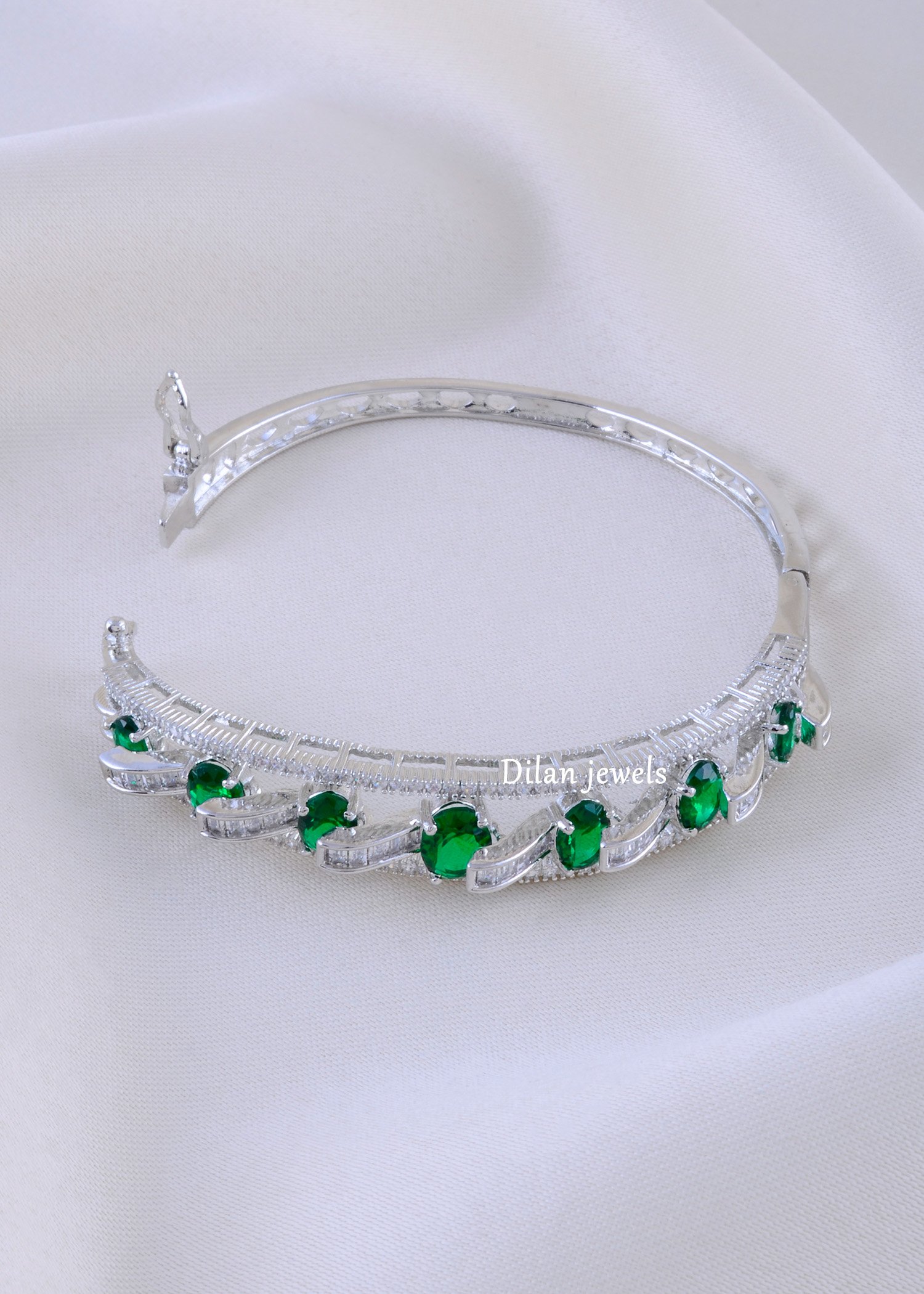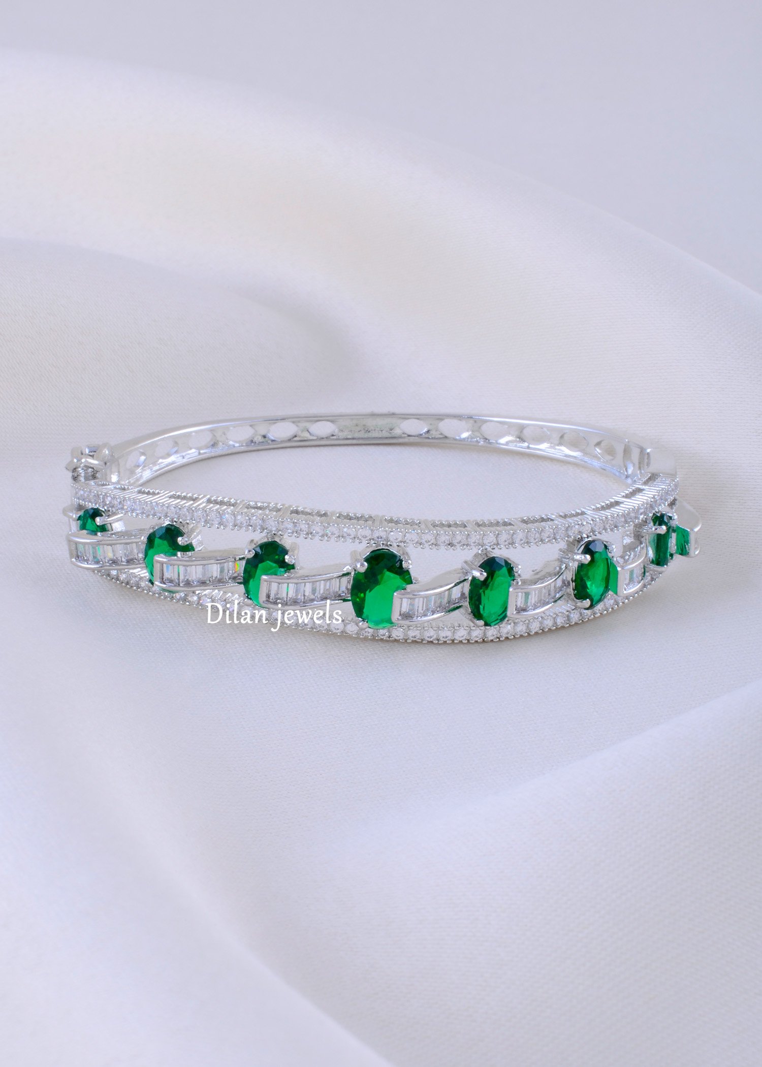 Add a touch of regal elegance to your ensemble with this magnificent hinged bangle, flawlessly crafted from premium German Silver. The bracelet showcases a striking central row of vibrant, oval-cut simulated emerald stones, beautifully separated by brilliant clear AAA-quality American Diamond baguettes. Micro-pave set ADs frame the central design, enhancing the intense sparkle and dimensional brilliance. Finished in a lustrous silver tone, this classic piece is perfect for adding aristocratic charm to festive events, formal occasions, or complementing sophisticated traditional wear.