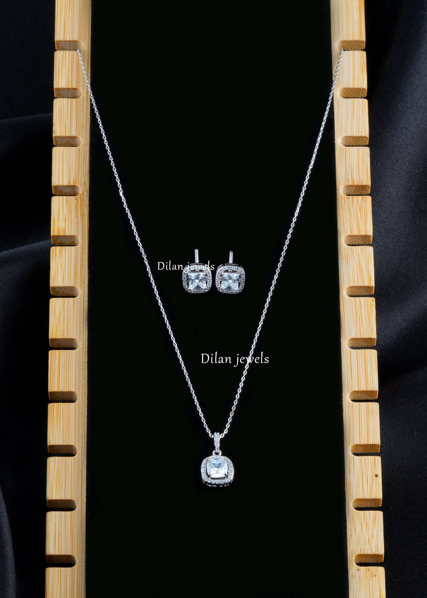 Add refined brilliance to your look with this elegant necklace set, crafted in premium German silver and adorned with AAA quality American diamonds. The pendant features a stunning 1.25 ct. center stone framed with delicate detailing, while the matching stud earrings showcase 0.75 ct. stones in a compact 0.7 cm size for a graceful finish. Lightweight and comfortable, this set is perfect for everyday elegance as well as special occasions. Its timeless design and radiant sparkle make it a versatile accessory that enhances both modern and traditional styles effortlessly.