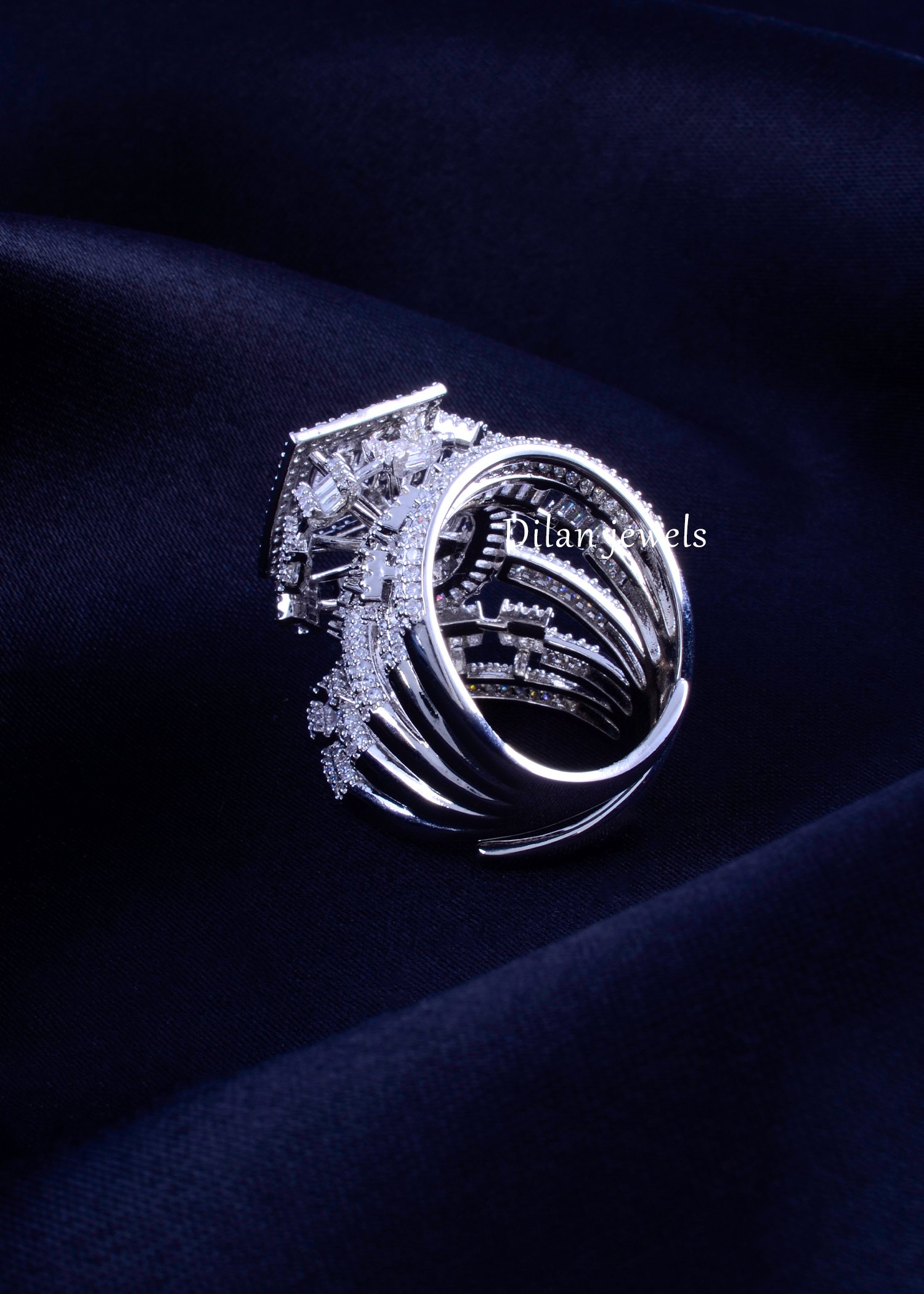 Make an unforgettable impression with this majestic silver-plated adjustable ring, masterfully crafted from premium German Silver. The ring boasts a breathtaking square cluster centerpiece, densely packed with radiant baguette and round-cut AAA-quality American Diamonds that catch the light from every angle. Its wide, multi-layered band features an elaborate, architectural design, adding depth and grandeur to the piece. The sleek silver finish enhances the brilliance of the stones, creating a look of pure opulence. With its comfortable openable band, this statement ring offers a perfect fit for any finger, making it an ideal choice for weddings, galas, or as a luxurious gift.