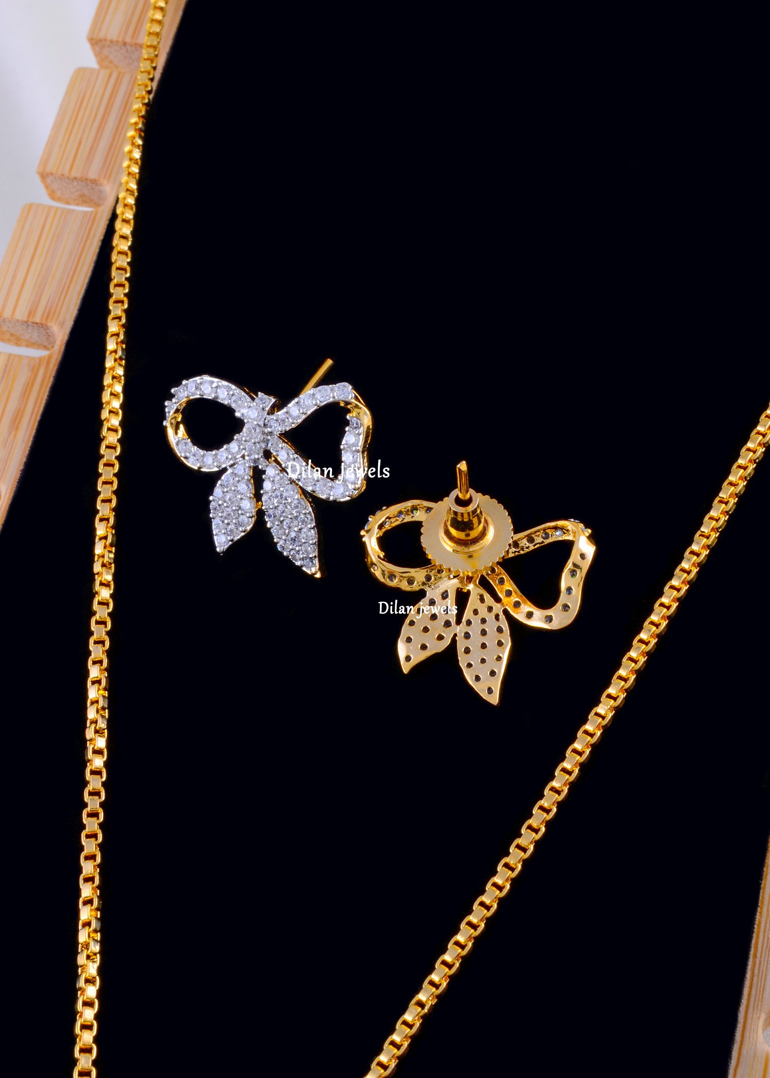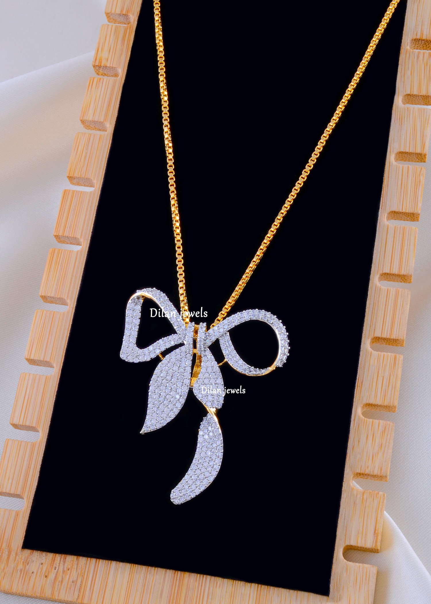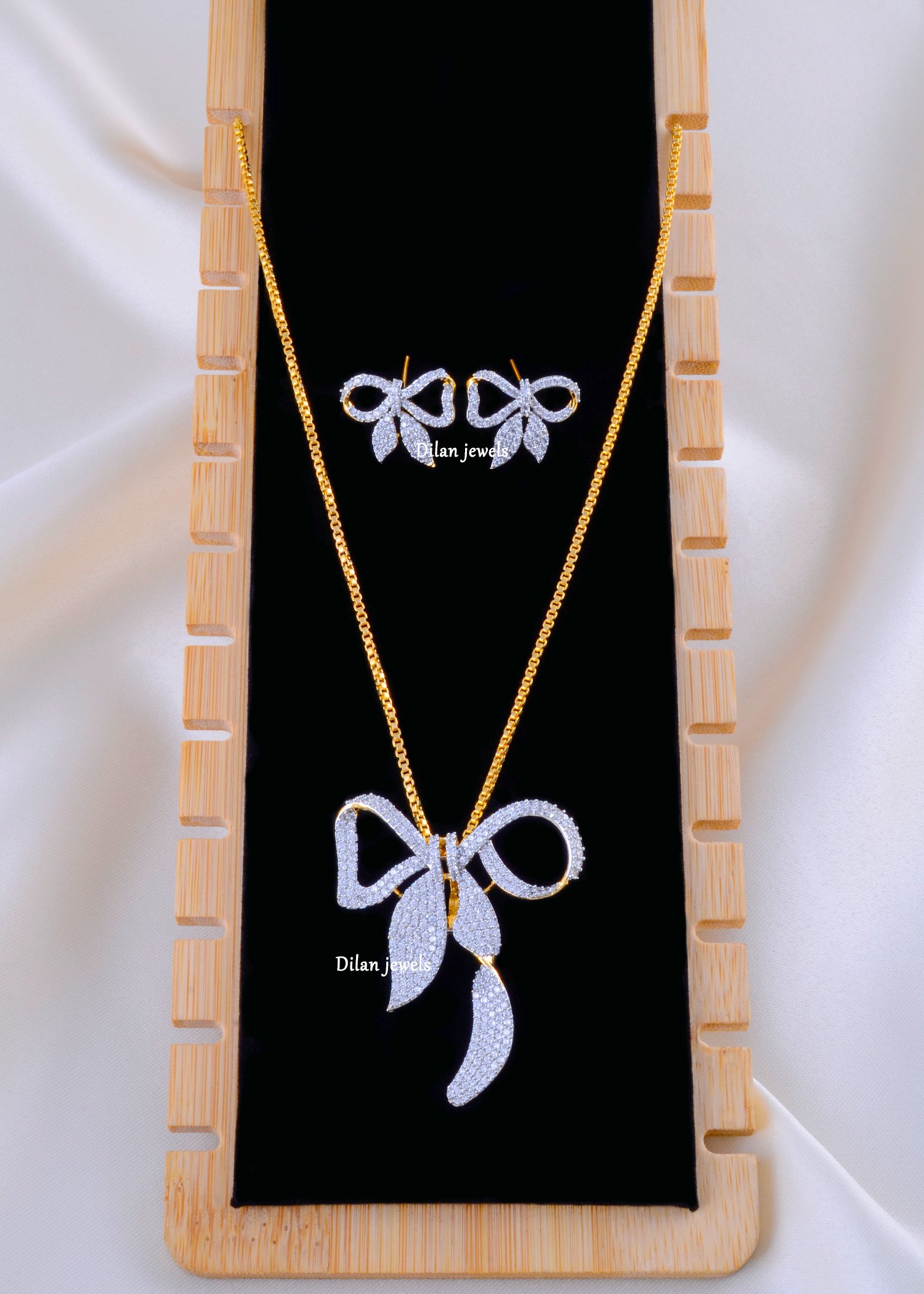 This elegant necklace set is crafted from premium German Silver and embellished with AAA quality American Diamonds that deliver a dazzling brilliance. The unique bow-inspired pendant and matching earrings add a modern yet graceful charm, perfect for weddings, festive occasions, or evening outings. Lightweight, durable, and skin-friendly, it offers a fine-jewellery look without compromising comfort. The golden chain beautifully complements the sparkling stones, making it a statement accessory for every wardrobe. A versatile and timeless piece that instantly elevates your style.