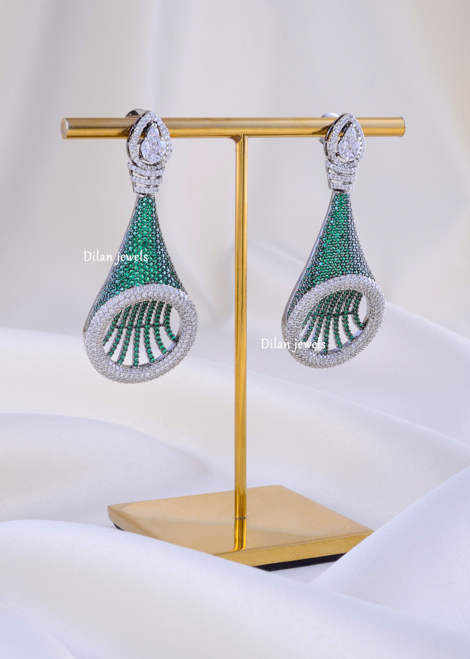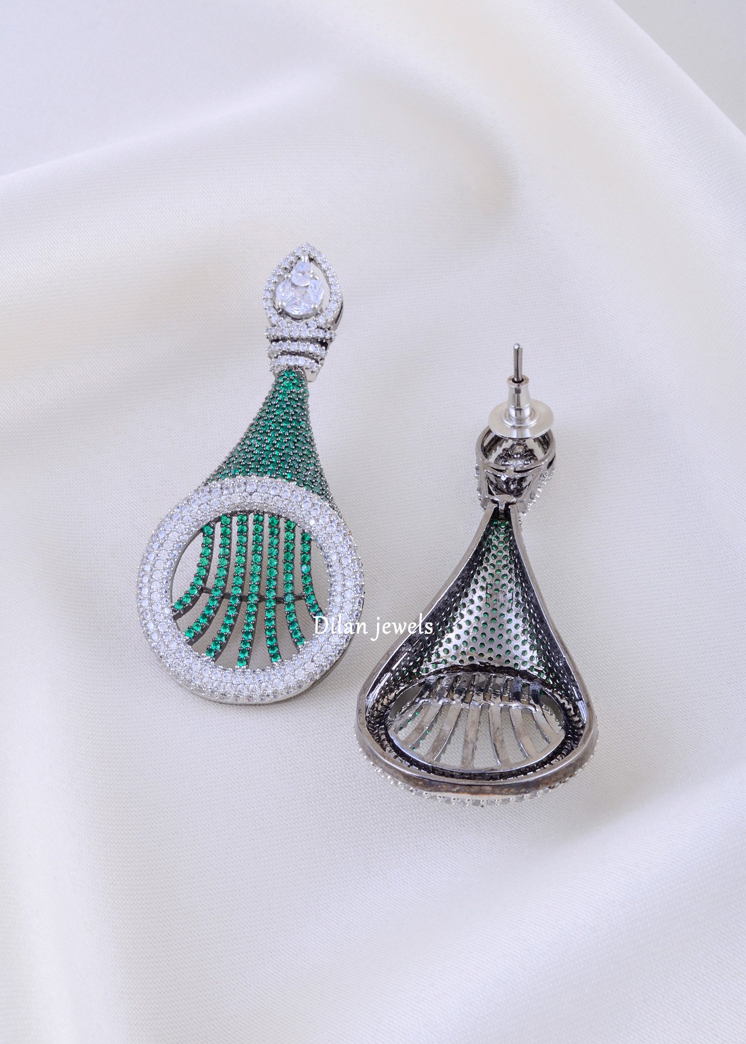 These exquisite earrings are crafted from premium German silver and embellished with AAA quality American diamonds, offering exceptional brilliance and durability. The contemporary teardrop silhouette paired with rich green stone detailing creates a luxurious and eye-catching design. Lightweight yet bold, they are perfect for weddings, parties, and festive occasions. The fine craftsmanship ensures long-lasting shine and comfortable wear, making them an ideal choice for anyone who loves elegant and modern statement jewelry.