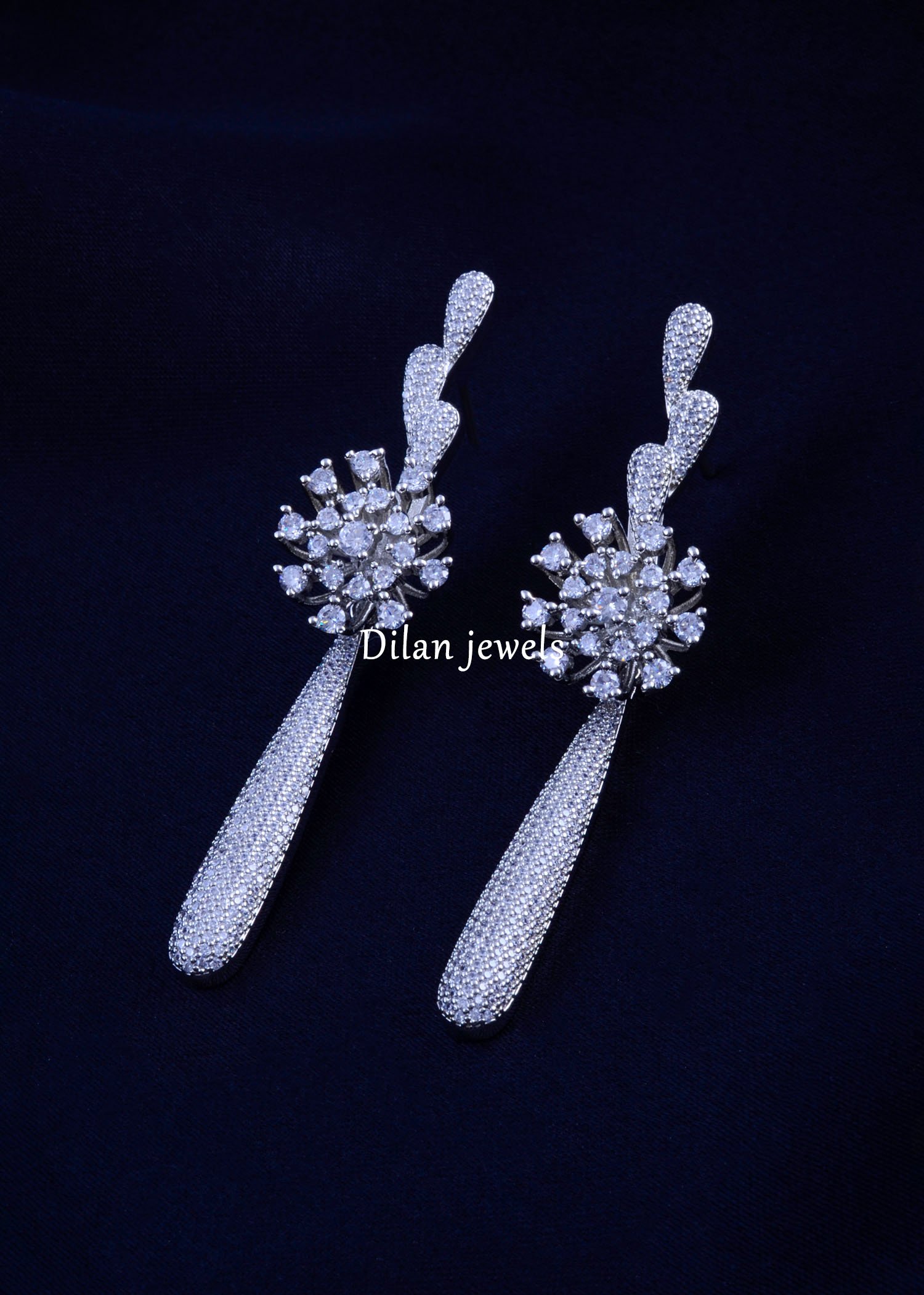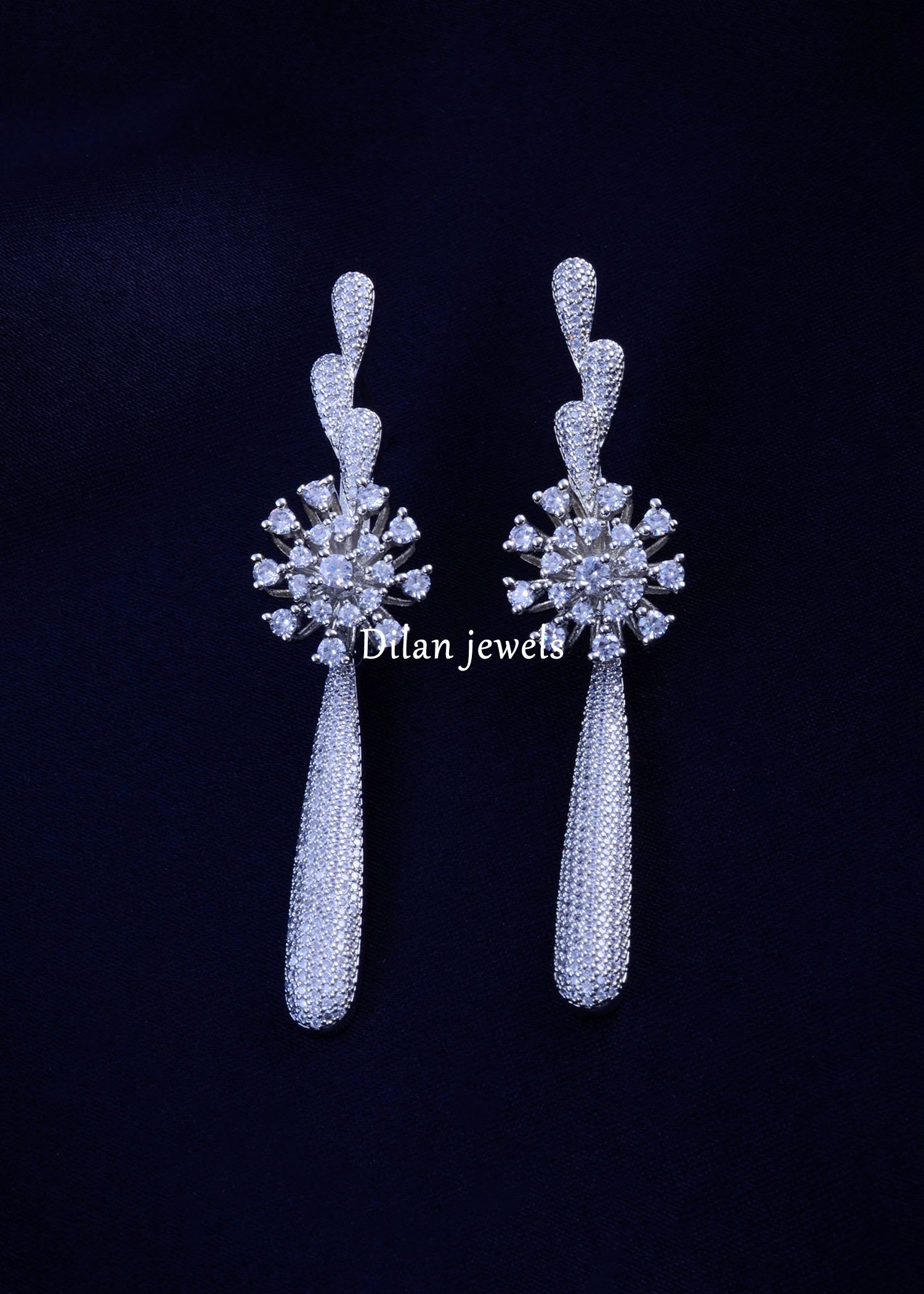 Elevate your style with these graceful long-drop earrings, masterfully crafted in German silver and encrusted with AAA quality American diamonds. The design features a radiant floral cluster at the center, enhanced with dazzling pave-set diamond trails that flow elegantly into a sleek drop. Lightweight yet statement-making, these earrings combine modern glamour with timeless sophistication, making them the perfect choice for weddings, parties, or red-carpet evenings. With their shimmering brilliance and refined craftsmanship, these earrings are designed to add instant luxury and poise to any outfit.