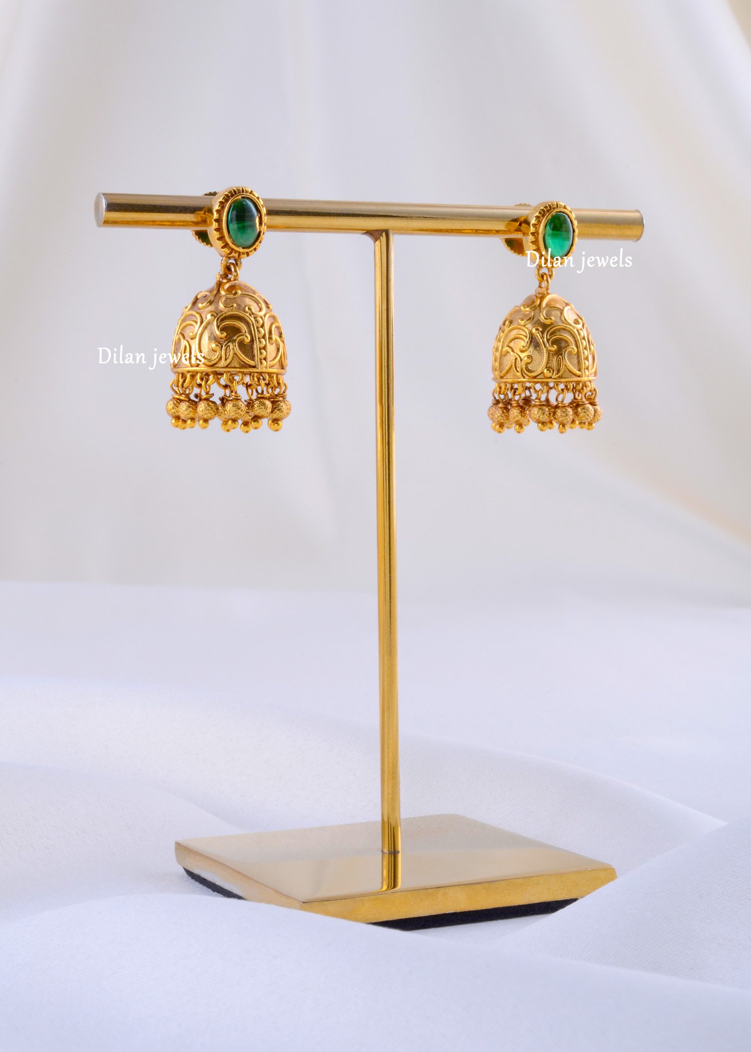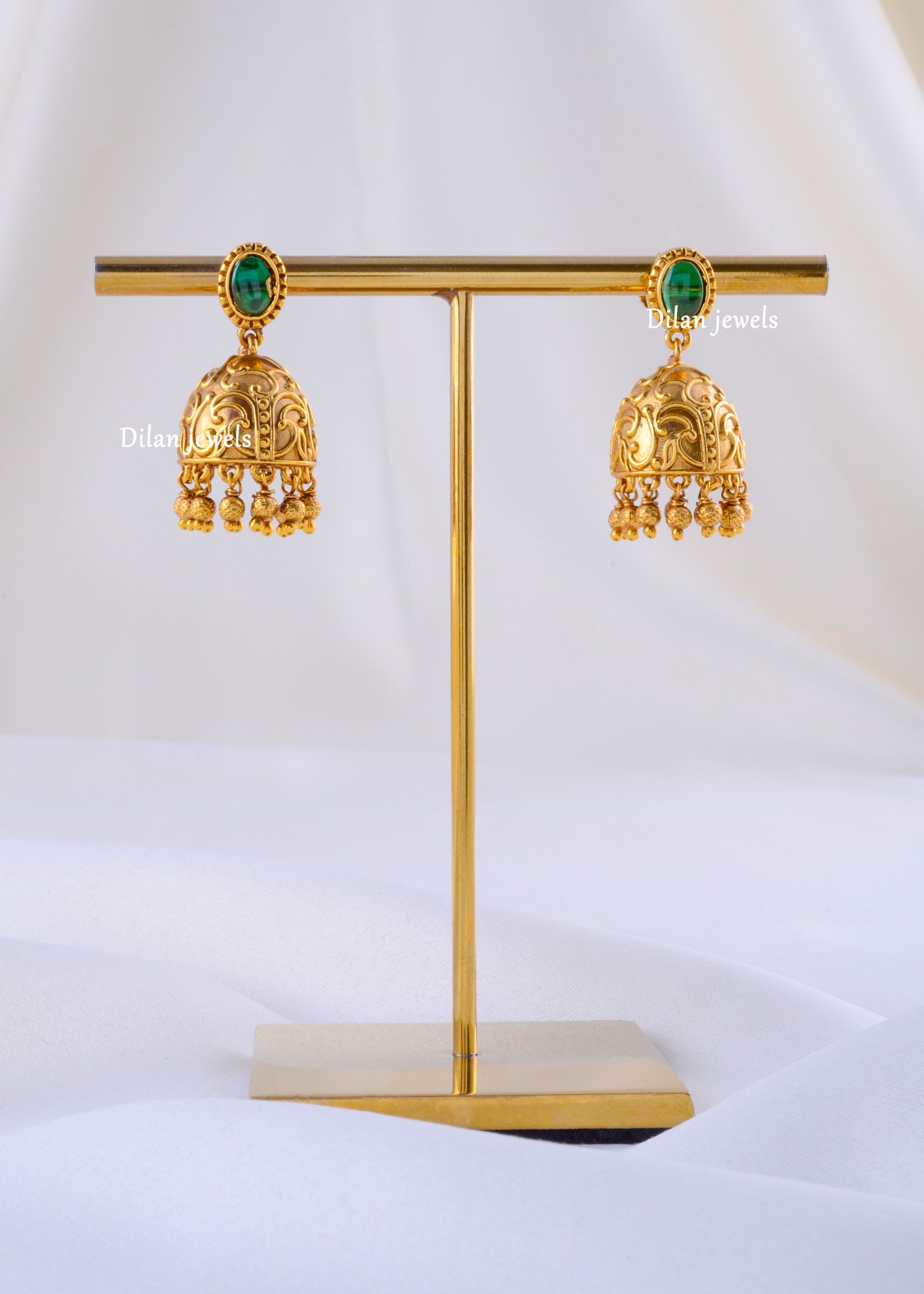 These elegant jhumka earrings are crafted in premium German silver with a rich antique gold finish, designed to bring timeless ethnic charm to your collection. The earrings feature a beautifully carved dome with intricate detailing and delicate ghungroo drops that add graceful movement. The top emerald-green stone stud enhances the traditional appeal while adding a pop of colour. Finished with AAA-quality American diamonds for a subtle sparkle, these jhumkas are perfect for festive occasions, weddings, and traditional outfits, offering comfort, style, and a royal heritage look.