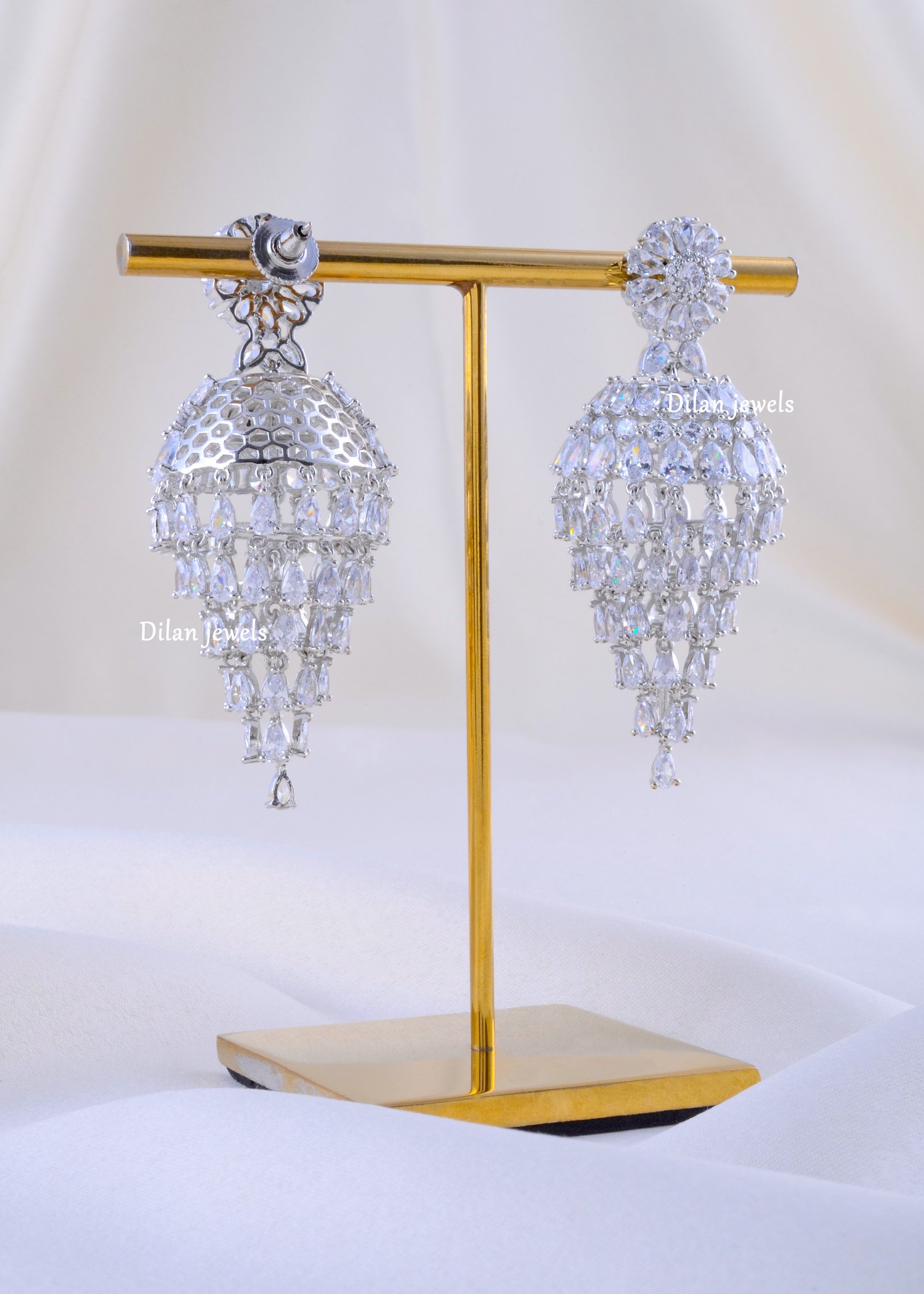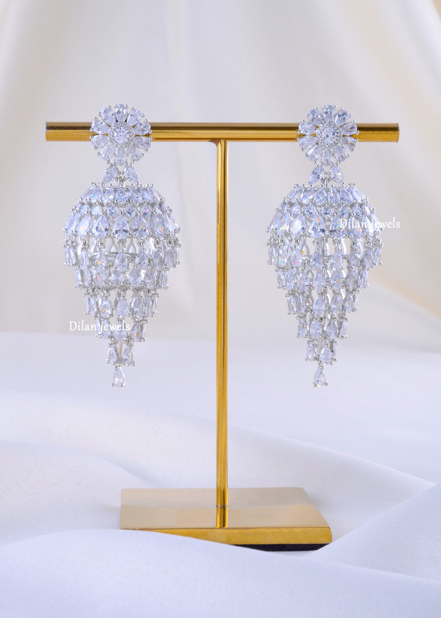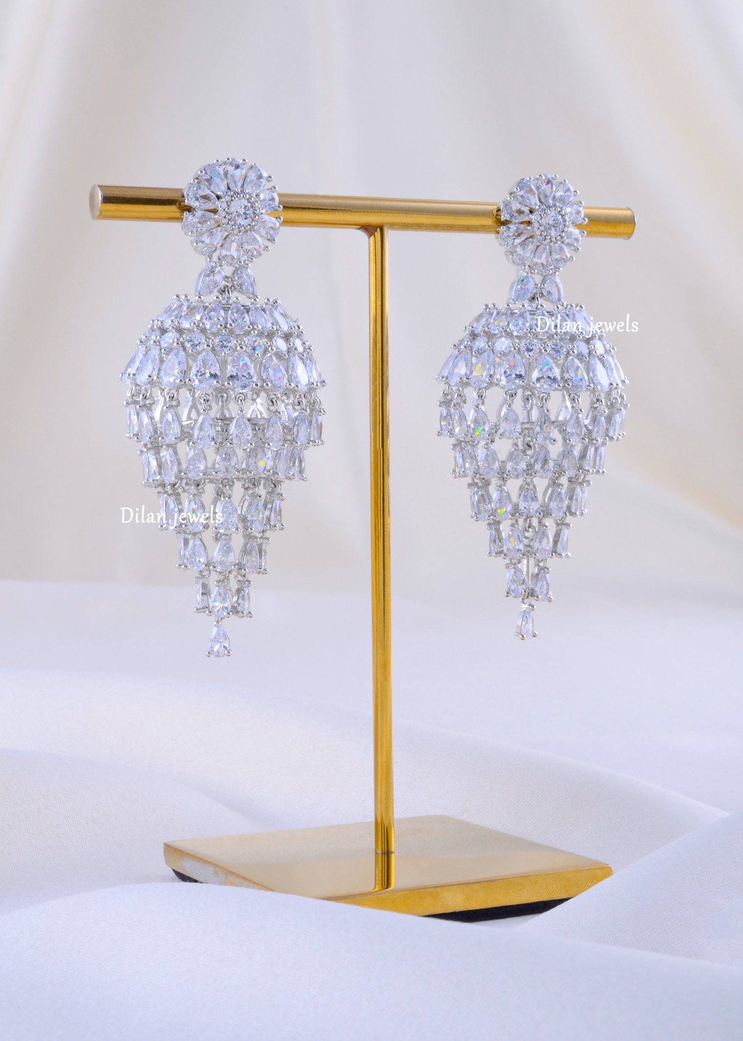 Prepare for the spotlight with these spectacular German Silver chandelier earrings. Plated in brilliant rhodium, the earrings feature an exquisite, dome-shaped silhouette from which multiple tiers of shimmering, marquise, and pear-cut AAA-quality American Diamonds cascade. The stones are meticulously hand-set to create a stunning waterfall effect that catches the light with every movement, delivering unmatched glamour. With a secure push-back stud, these oversized, dazzling drops are the ultimate accessory for weddings, gala events, or any occasion where you need maximum, high-end sparkle.