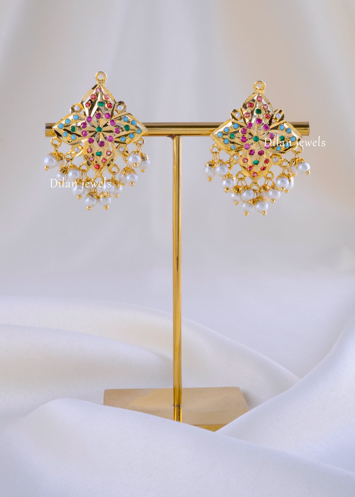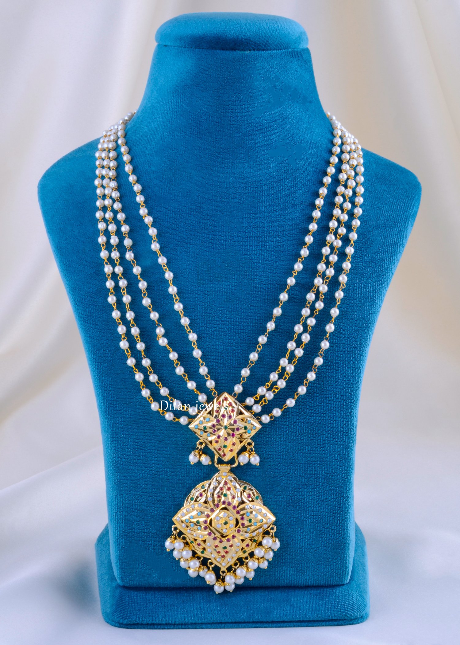 Radiate regal elegance with this exquisite kundan necklace set, expertly crafted from premium German Silver with a luxurious gold finish. The set features an ornate multi-strand pearl necklace with four graceful strands of lustrous white pearls connected by an intricate two-tiered diamond-shaped kundan pendant embellished with vibrant multicolor gemstones and pearls. The matching chandelier earrings showcase identical diamond-shaped kundan designs with colorful stone inlays and dangling pearl beads. The sophisticated interplay of pearls, gemstones, and filigree metalwork creates a stunning bridal statement. Perfect for weddings, festivals, celebrations, and special occasions, this elaborate set delivers heritage craftsmanship. The complete jewelry set offers affordable luxury with authentic ethnic appeal and undeniable sophisticated elegance.
