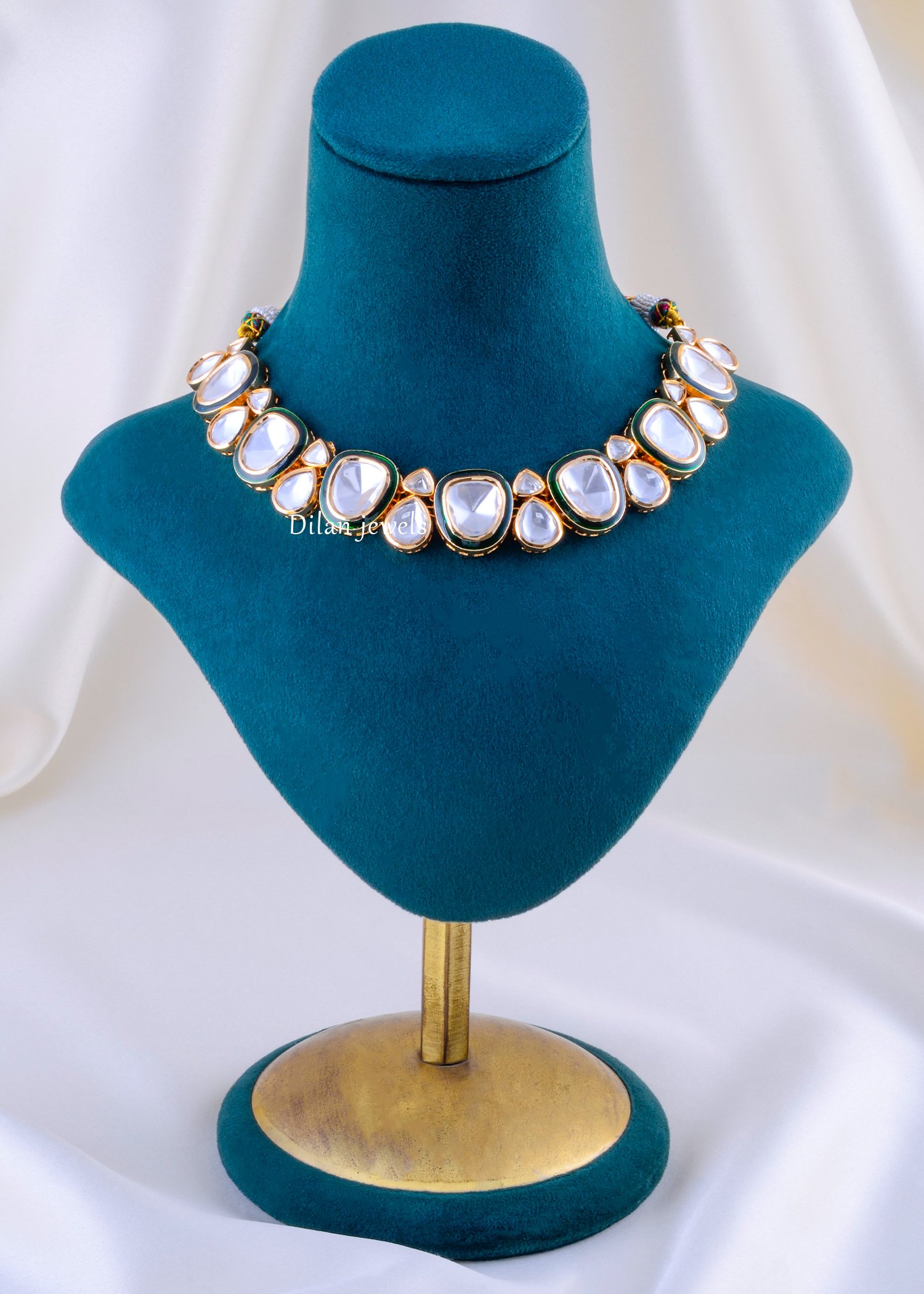 Radiate classic elegance with this sophisticated kundan necklace set, expertly crafted from premium German Silver with a luxurious gold finish. The set features a stunning choker necklace showcasing alternating white kundan gemstones in ornate teardrop and oval settings with decorative gold borders and enamel detailing. The elegant design combines traditional craftsmanship with modern aesthetics, creating a timeless statement piece. The matching drop earrings showcase identical white gemstones with hanging teardrop accents, ensuring perfect coordination. Perfect for weddings, traditional celebrations, festive occasions, and special events, this refined set elevates any bridal ensemble. The complete coordinated jewelry set delivers affordable luxury with authentic heritage craftsmanship and undeniable sophistication.