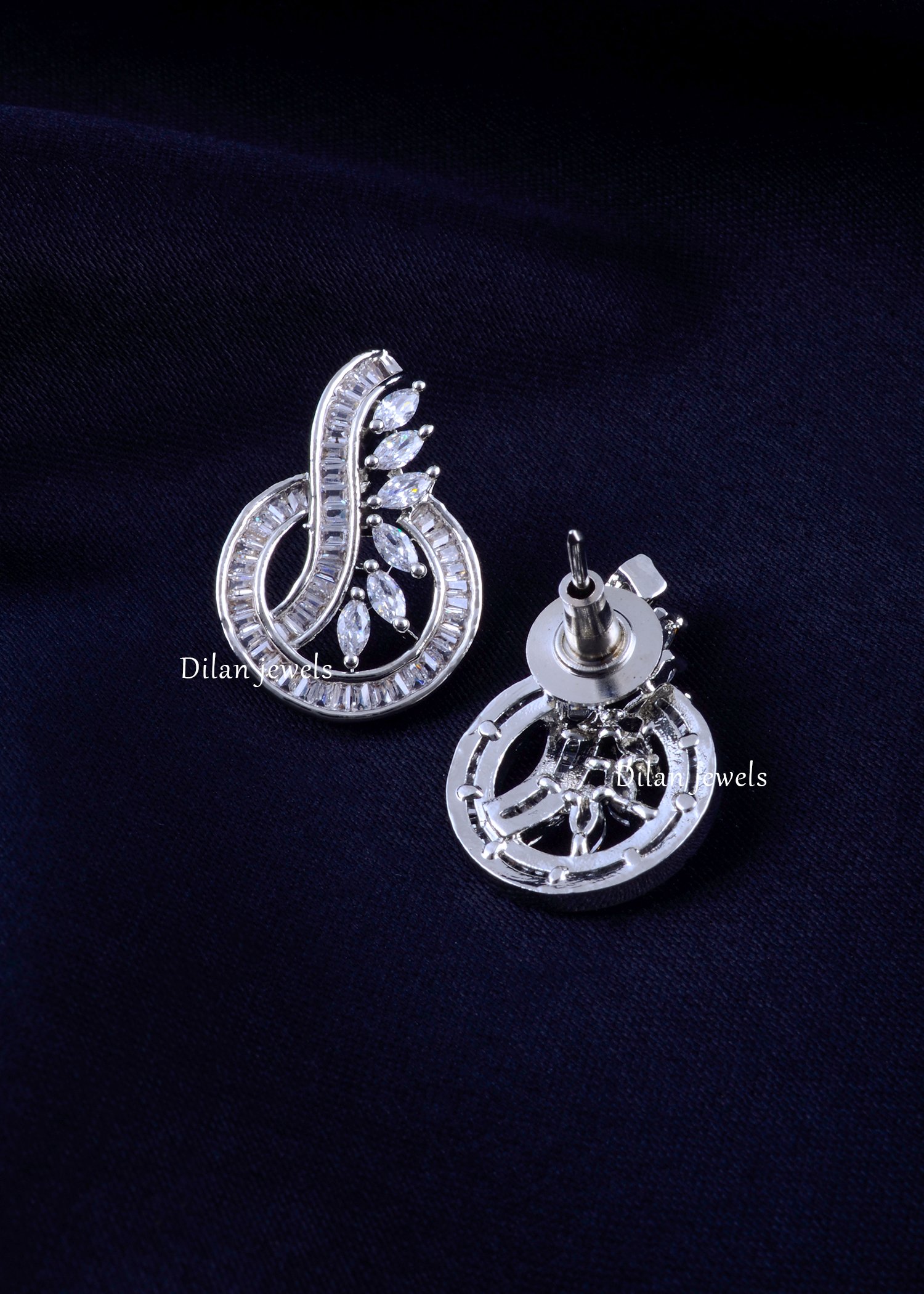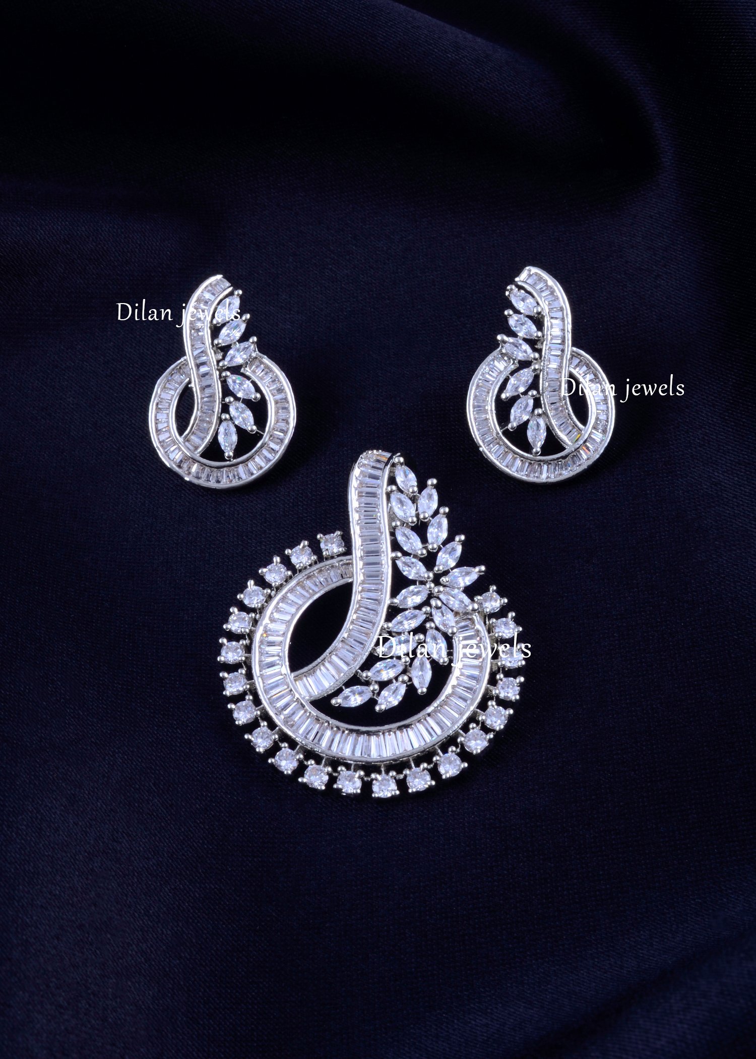 Elevate your jewelry collection with this exquisite German Silver Pendant Set, a perfect blend of contemporary design and timeless sparkle. Expertly crafted with AAA quality American Diamonds, this set features a mesmerizing interplay of stone cuts. A sweeping curve of channel-set baguette crystals intertwines with a delicate arrangement of marquise-cut stones, creating a sophisticated floral-abstract motif. The pendant is framed by a brilliant halo of round solitaires for added luster. Complete with matching stud earrings that mirror the pendant’s elegance, this set offers a luxurious, diamond-like finish perfect for cocktail parties, festive gatherings, or as a cherished gift.