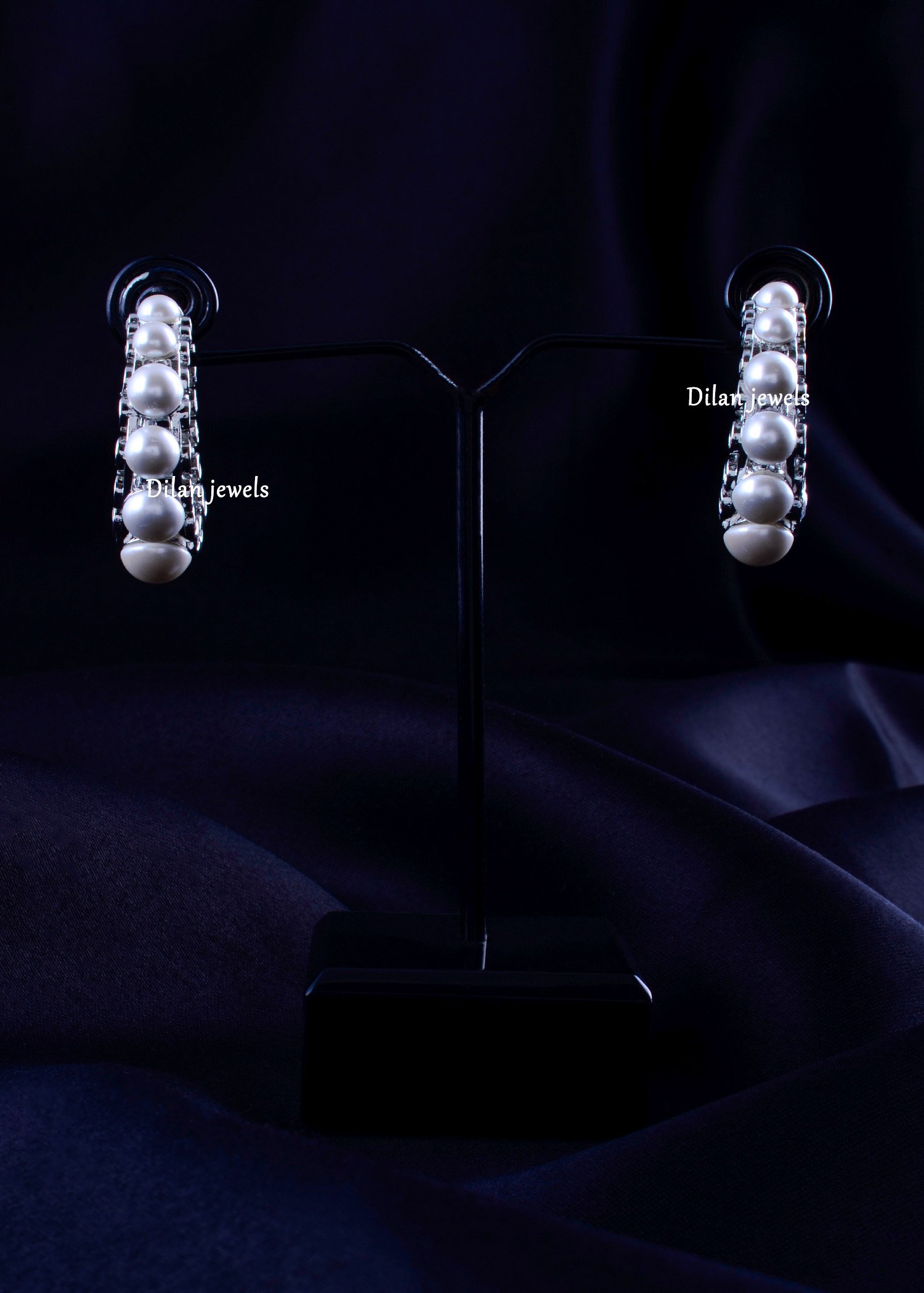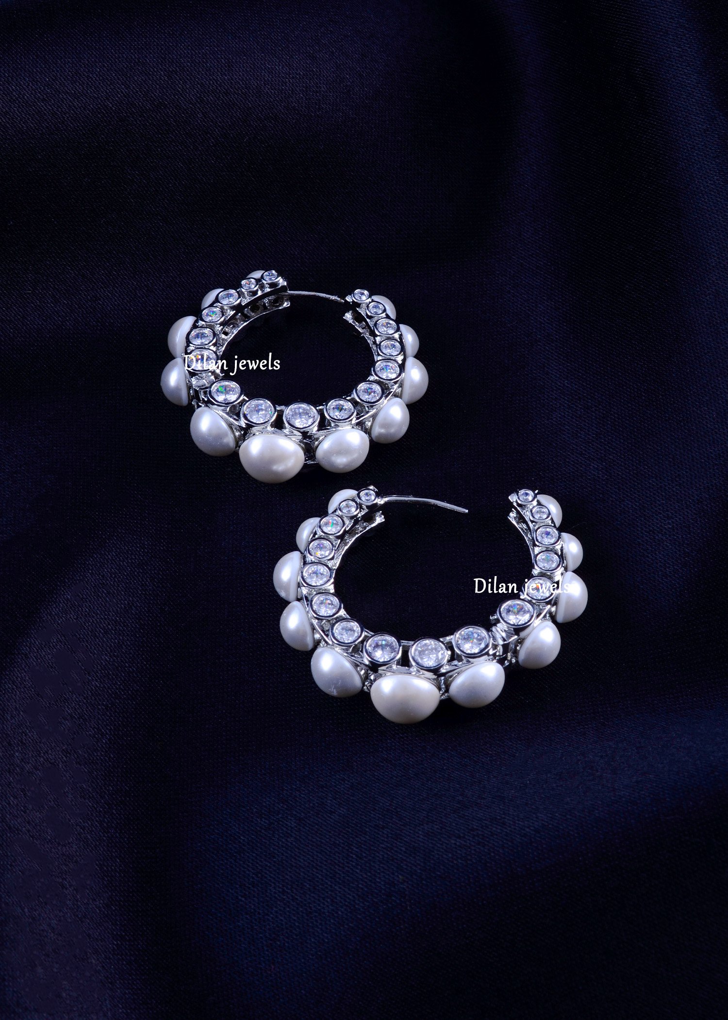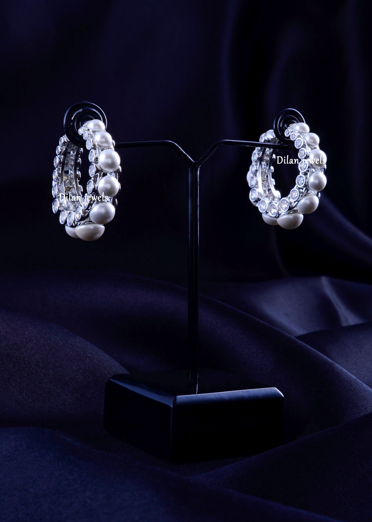 Elevate your jewelry collection with these exquisite handcrafted hoop earrings, perfectly blending contemporary charm with timeless elegance. Expertly fashioned from high-quality German Silver, each earring features a brilliant central row of sparkling AAA-quality American Diamonds (AD), flanked by rows of lustrous white pearls that add a soft, sophisticated glow to the design. The durable silver-tone finish ensures long-lasting shine, making these hoops an ideal accessory for both festive ethnic wear and chic western outfits. Lightweight yet statement-making, these balis offer a luxurious look perfect for adding a touch of glamour to your evening ensemble.