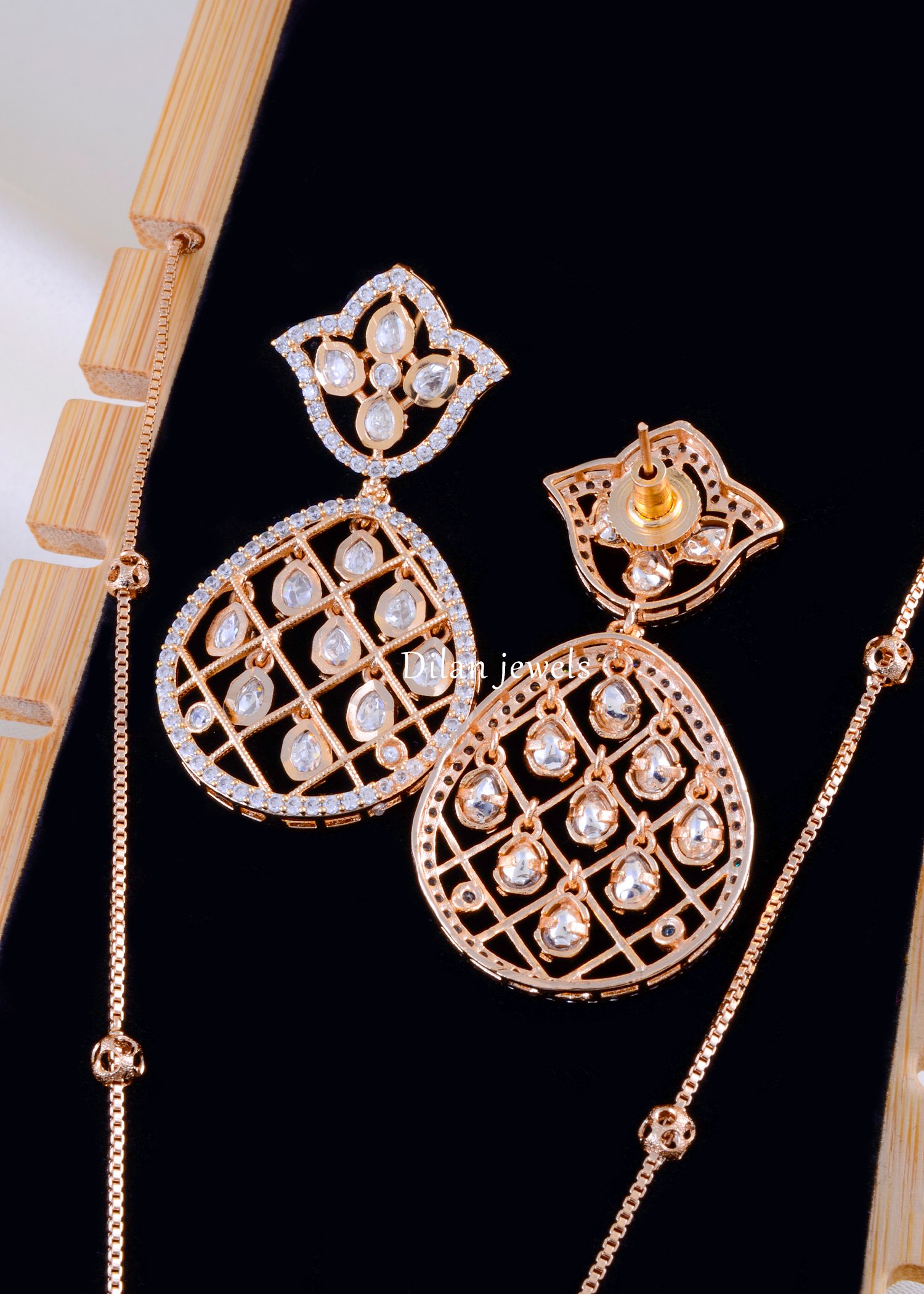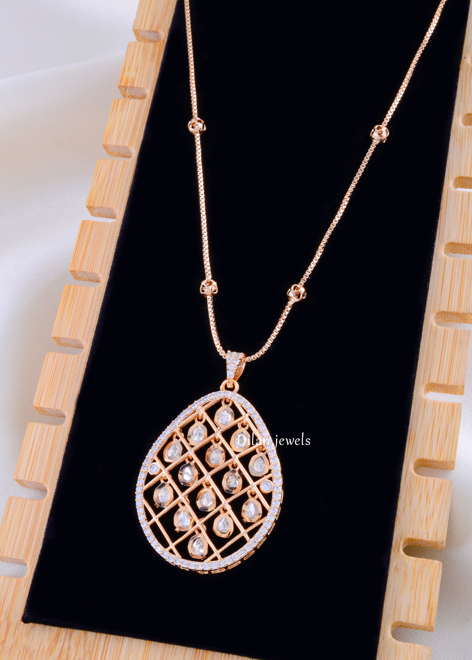Elevate your elegance with this exquisite diamond necklace set, expertly crafted from premium German Silver with lustrous rose gold plating. The set features a stunning teardrop-shaped pendant adorned with intricate lattice design embellished with brilliant AAA-quality American Diamond stones arranged in a captivating geometric pattern. The matching pair of four-petaled stud earrings showcase delicate diamond work for perfect coordination. An adjustable, beaded chain necklace with spherical gold spacers completes the sophisticated ensemble. The sparkling diamonds catch light beautifully from every angle, creating timeless brilliance. Perfect for weddings, festive celebrations, and special occasions, this glamorous set delivers affordable luxury with authentic charm and undeniable sophistication.