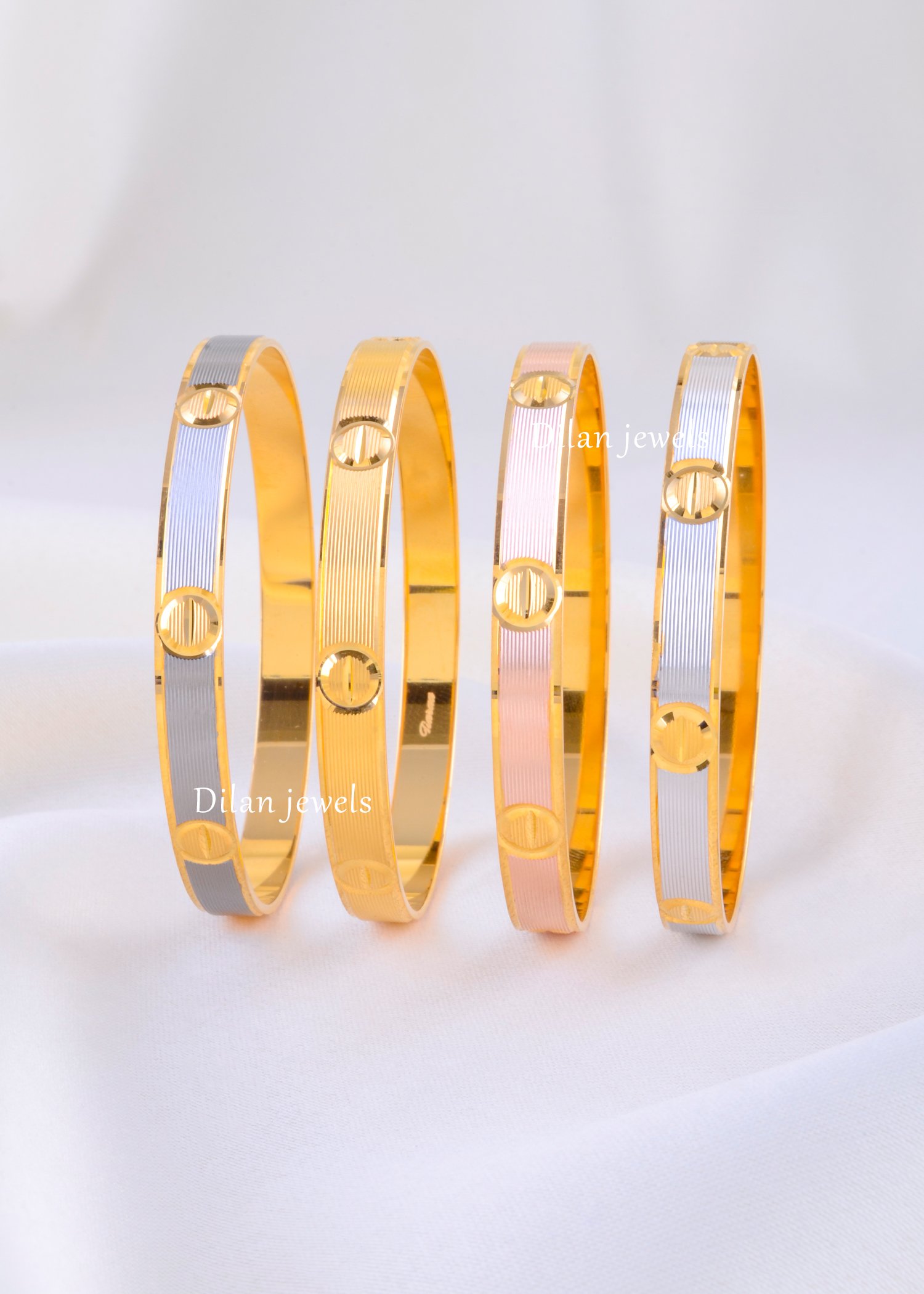 Discover timeless sophistication with these premium German silver bangles, beautifully finished with a luxurious 22 Karat gold coating. Designed with sleek vertical line detailing and signature round motifs, these bangles offer a perfect blend of modern minimalism and classic charm. Lightweight, durable, and skin-friendly, they add a refined elegance to any outfit—whether casual, office wear, or festive occasions. Available in stunning dual-tone options, this versatile piece is crafted to complement every style and enhance your everyday look with effortless grace.