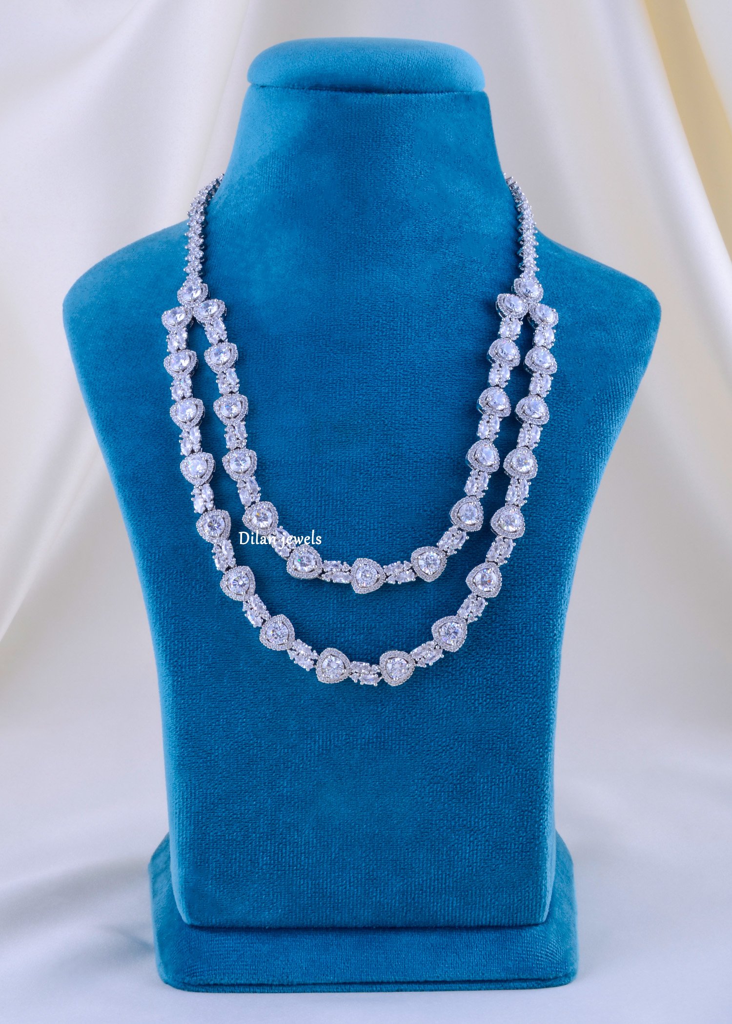 Enhance your special moments with this luxurious German silver necklace set, crafted with double-layered elegance and embellished with radiant AAA-quality American diamonds. The heart-shaped and round-cut stones are intricately arranged to create a timeless, sparkling masterpiece that beautifully complements both ethnic and contemporary outfits. The matching drop earrings complete the look with graceful brilliance, making this set ideal for weddings, receptions, parties, and festive occasions. Lightweight, durable, and irresistibly glamorous, this necklace set adds a regal charm to your jewellery collection and ensures you shine effortlessly.