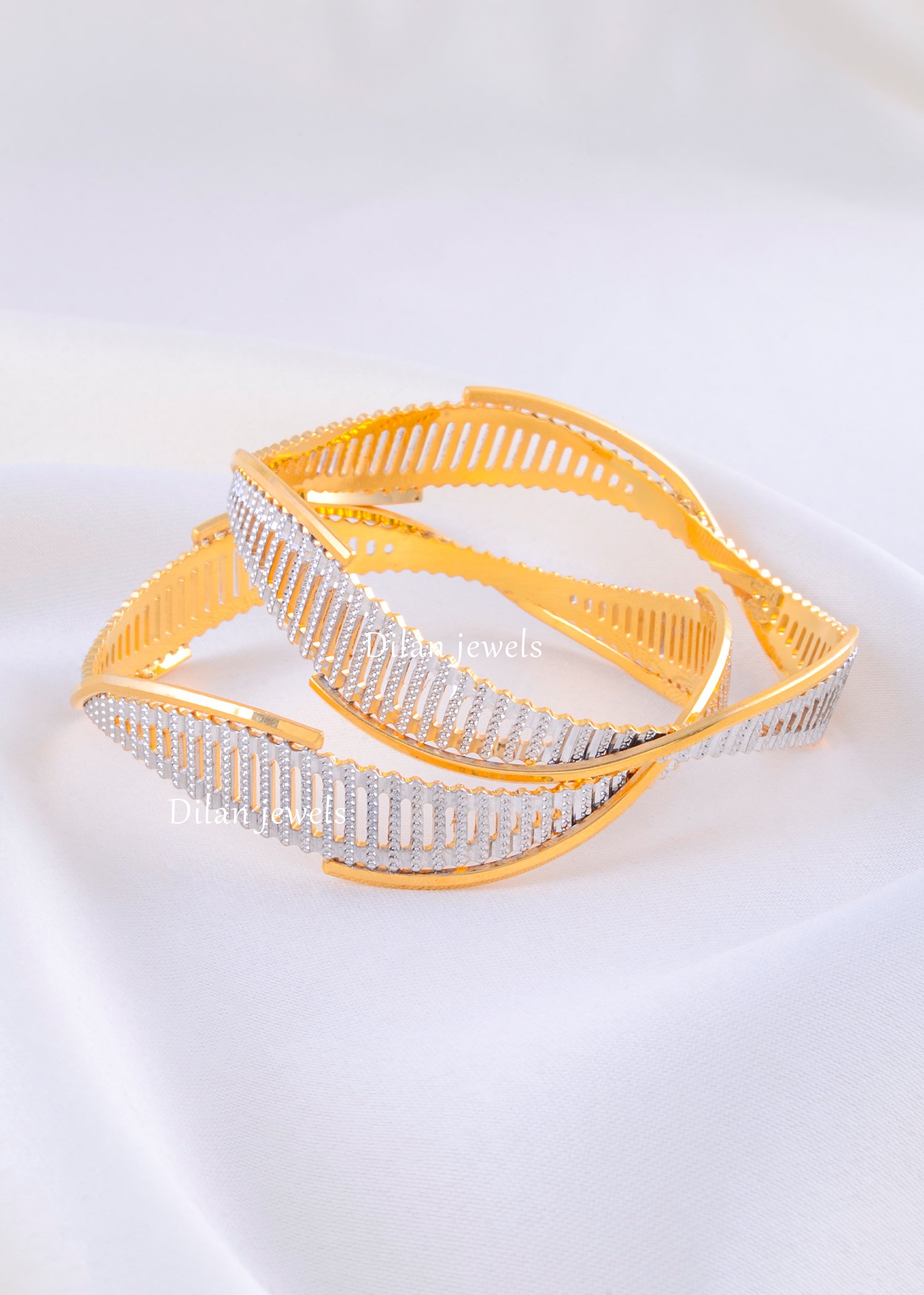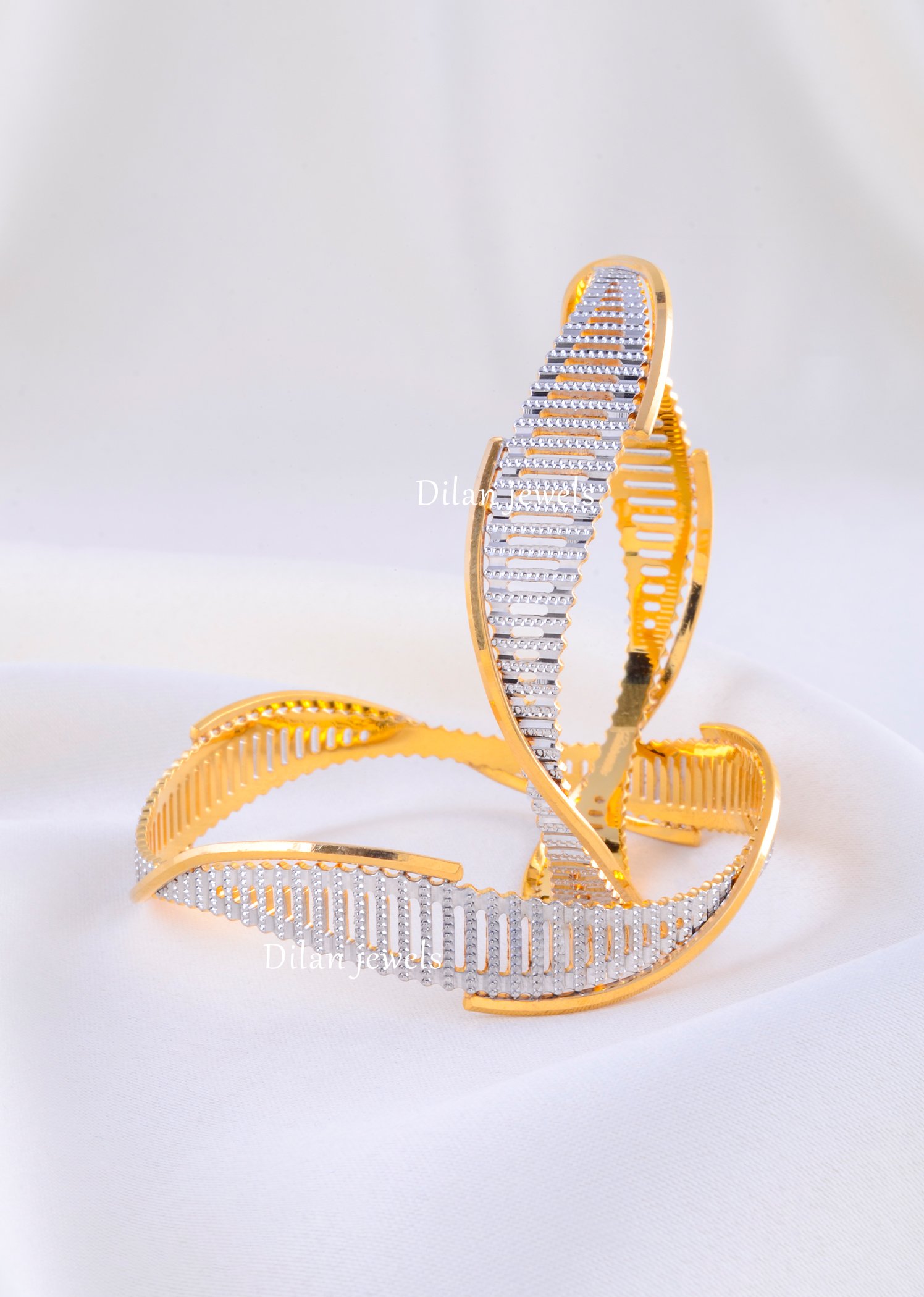 Add a touch of modern elegance to your look with these beautifully handcrafted bangles made from premium German silver and finished with a rich 22 Karat gold coating. Designed with a unique twisted pattern and lined with shimmering AAA-quality American Diamonds, these bangles reflect exceptional craftsmanship and luxurious shine. Lightweight, durable, and eye-catching, they pair perfectly with both ethnic and contemporary outfits. Ideal for weddings, festive events, parties, or everyday sophistication—these bangles bring effortless glamour to your jewellery collection.