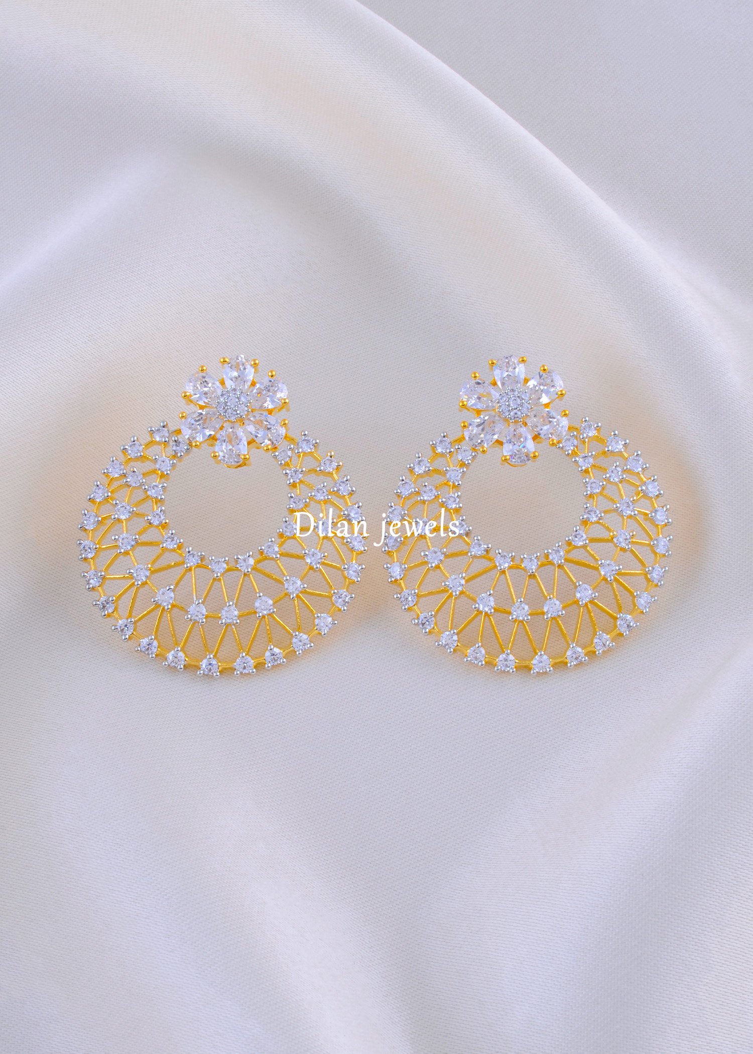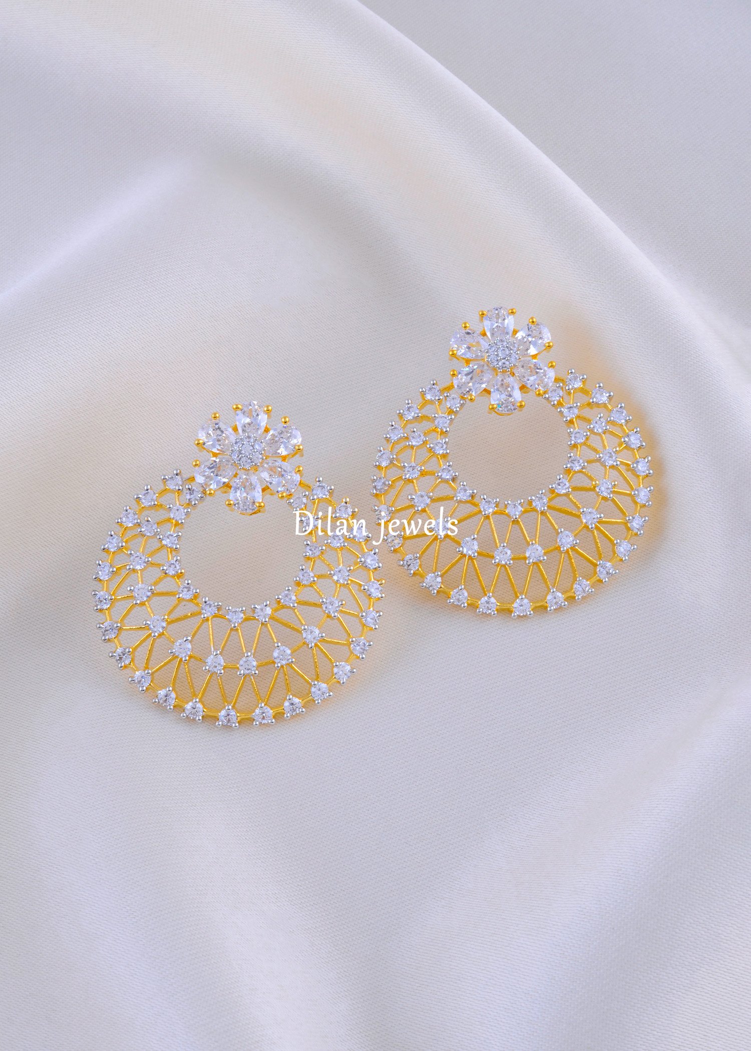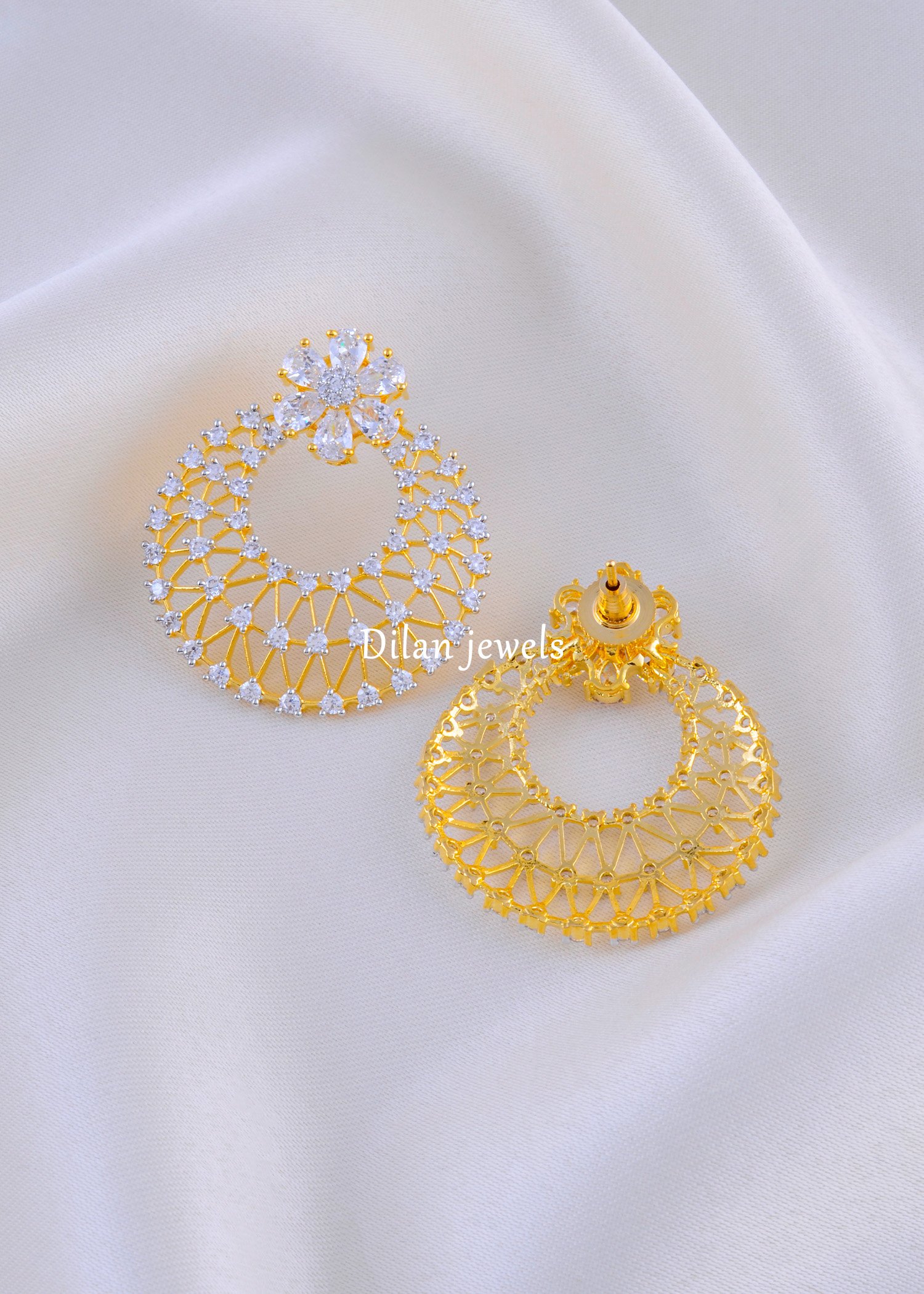 Adorn yourself with these dazzling Gold-Plated Floral Chandbalis, meticulously crafted from German Silver. The large, eye-catching hoop showcases an elegant web-like filigree pattern, beautifully highlighted by a shower of brilliant AAA quality American Diamonds (Cubic Zirconia). A sparkling white floral stud secures the earring, providing a balanced, classic finish. With their luxurious golden luster and intricate diamond setting, these statement earrings are the ideal accessory for weddings, reception parties, or any grand festive event, offering premium quality and unmatched sparkle.