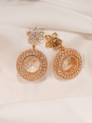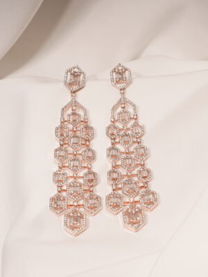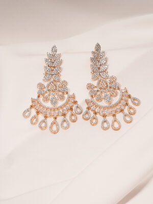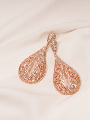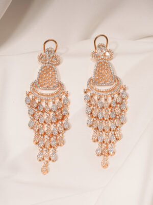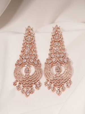 🔵 Metal: German Silver (Silver Alloy) 🔵 Stones: AAA+ Quality American Diamonds 🔵 Plating: Rose- Gold 🔵 Earring Length : 10.00cm 🔵 Closure: Push-back 🔵 Lifetime Guarantee on stones 🔵 For Jewellery Care, please refer here 🔵 For Exchange Policy, please refer here